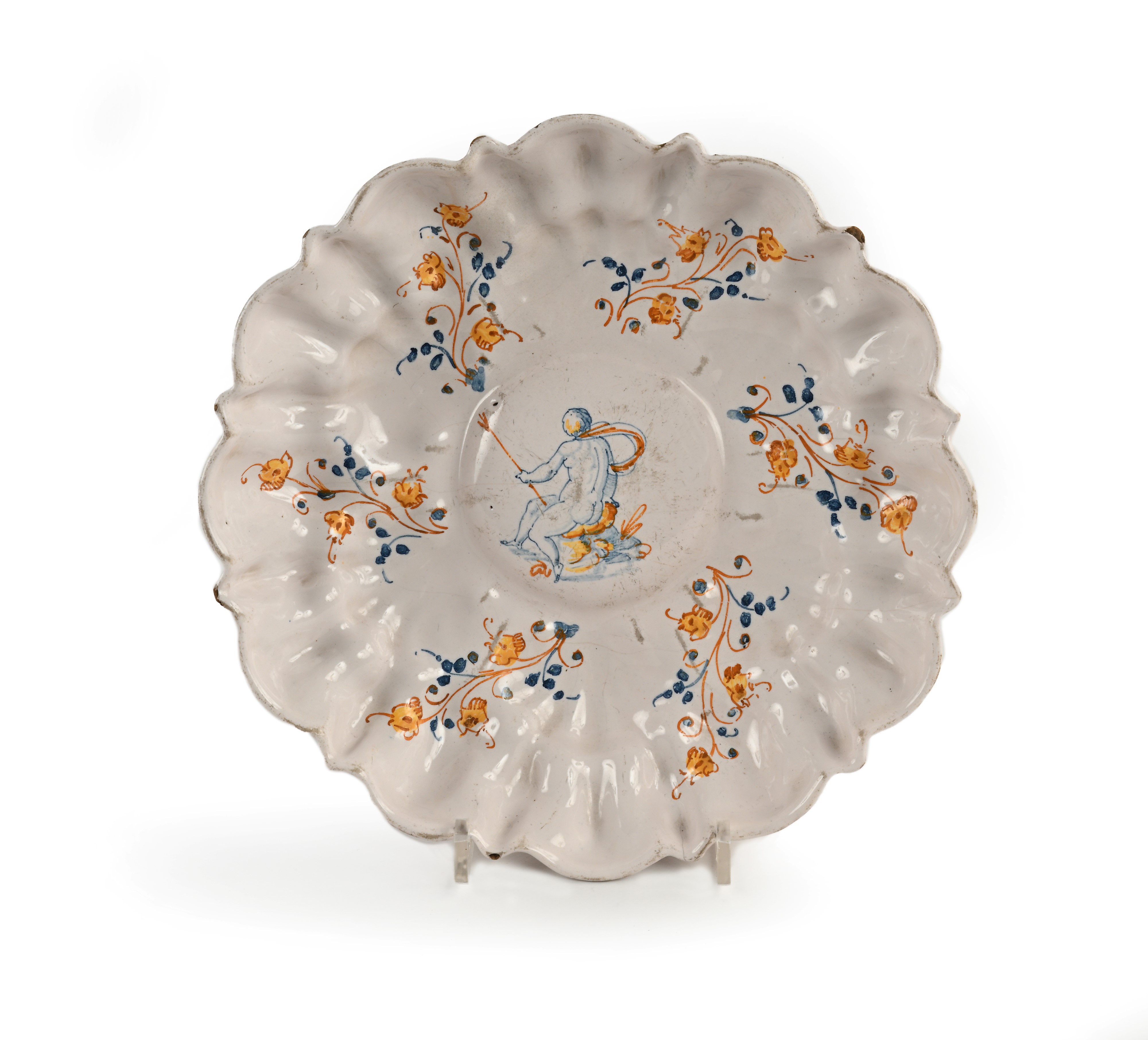 con piatto mosso e baccellato ed orlo sagomato a smerli, caratterizzata da umbone con figura circondata da esili tralci fioriti in blu e giallo oro