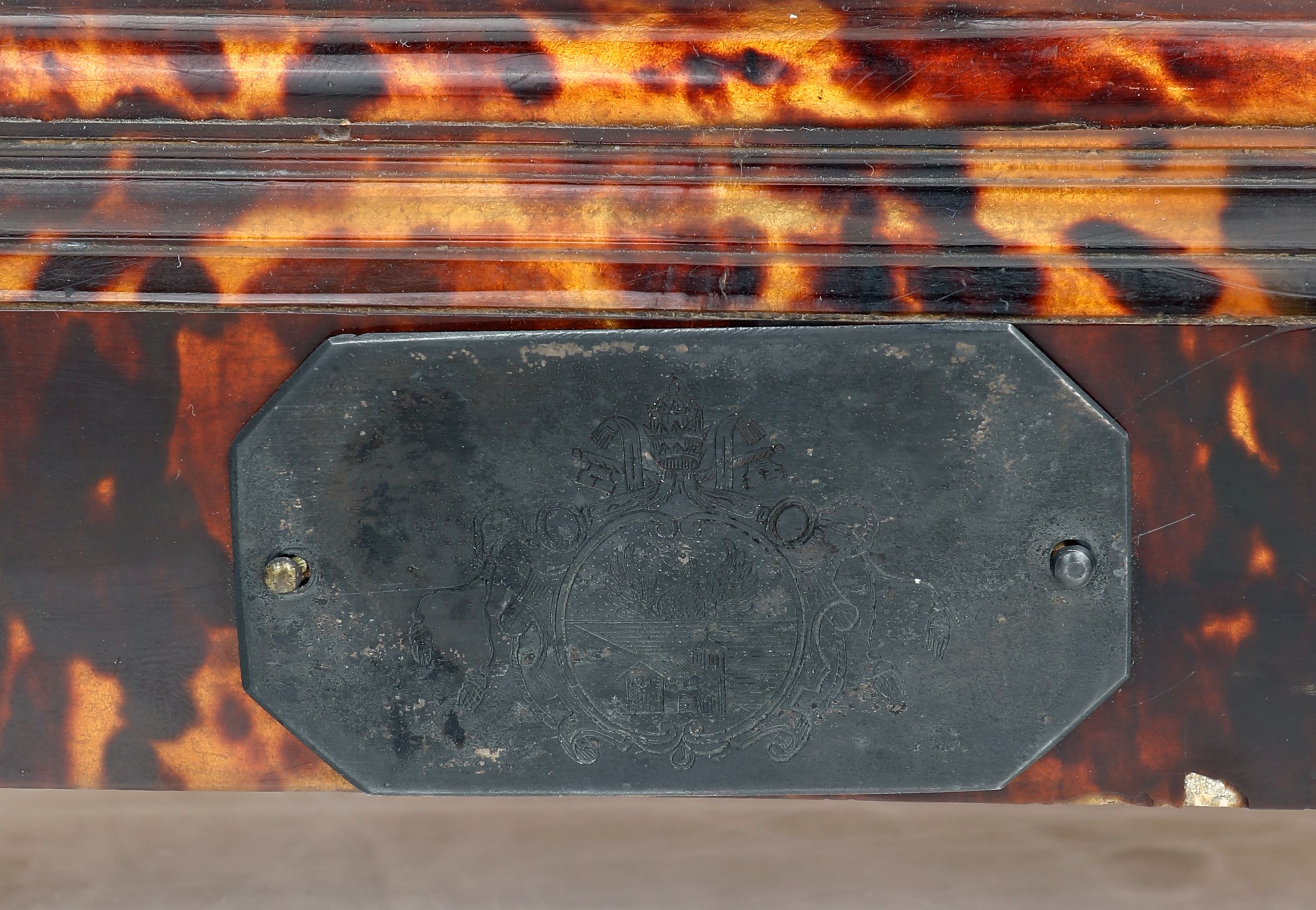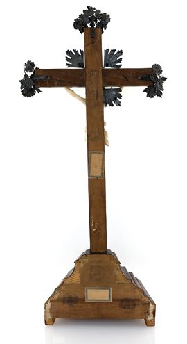 Corpus Christi realisticamente intagliato, con i piedi congiunti e la testa reclinata verso la spalla destra, è rappresento come Cristo trionfante su una croce di luce, secondo una consuetudine iconografica che unisce l’immagine del Cristo inchiodato sulla croce a quella del Redentore che torna nel giorno del Giudizio finale; il busto teso nello sforzo, le gambe terminano con i piedi rigidi, sovrapposti e fissati da un unico chiodo. Il perizoma, drappeggiato con cura, si caratterizza per un ampio panneggio annodato sul fianco destro. La croce, realizzata in tartaruga, si erge su un piedistallo architettonico ed è impreziosita da terminali in argento finemente decorati con motivi floreali e fogliati. Al centro, nell’incrocio dei bracci, spiccano elementi a raggiera in argento; sulla parte superiore è presente il Titulus Crucis. Sulla base targa in argento con stemma di Papa Benedetto XV inciso, sormontato dal triregno pontificio con le chiavi. Al verso etichette cartacee e tre timbri ad inchiostro non interamente leggibili. Punzonato sul Titulus Crucis e sui terminali con il marchio della "bulla" di Palermo raffigurata da un’aquila a volo alto in uso dal 1715 al 1825 e con il marchio DGG78, improntato nel 1778 dal console Don Gioacchino Carafa. Piccole mancanze.