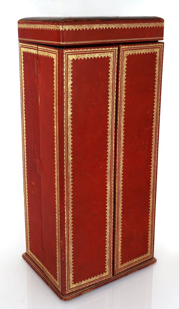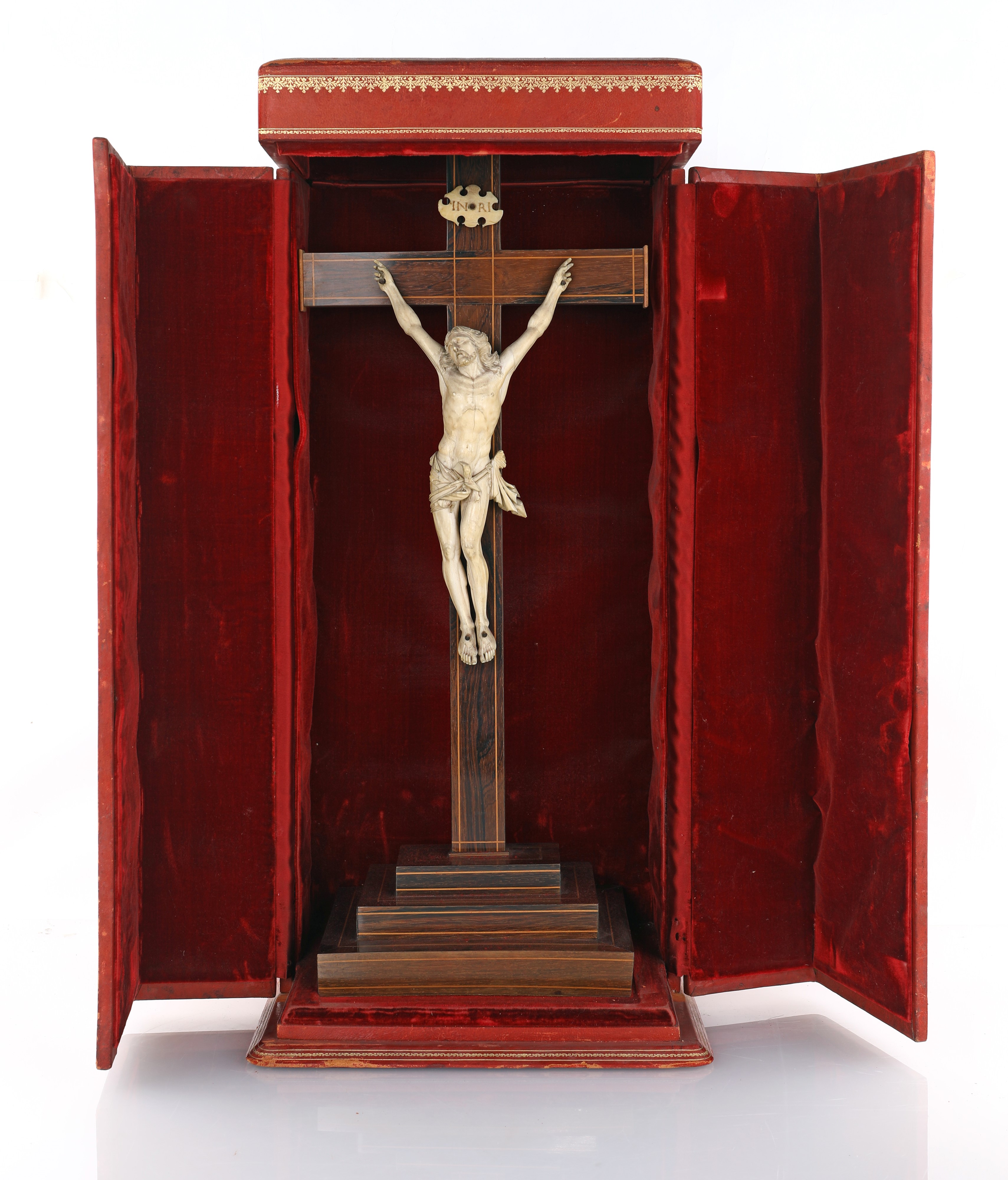 Il crocifisso è custodito all’interno di una elegante custodia in pelle rossa con decorazione sovrimpressa in oro. L’insieme unisce sapienza tecnica e profonda spiritualità, trasformando il crocifisso in un oggetto di devozione e contemplazione