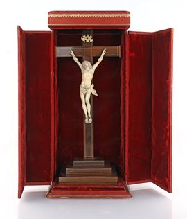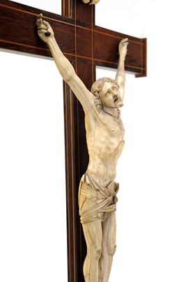 Cristo in avorio su croce in palissandro con filettature, Francia, fine XVII/inizio XVIII secolo