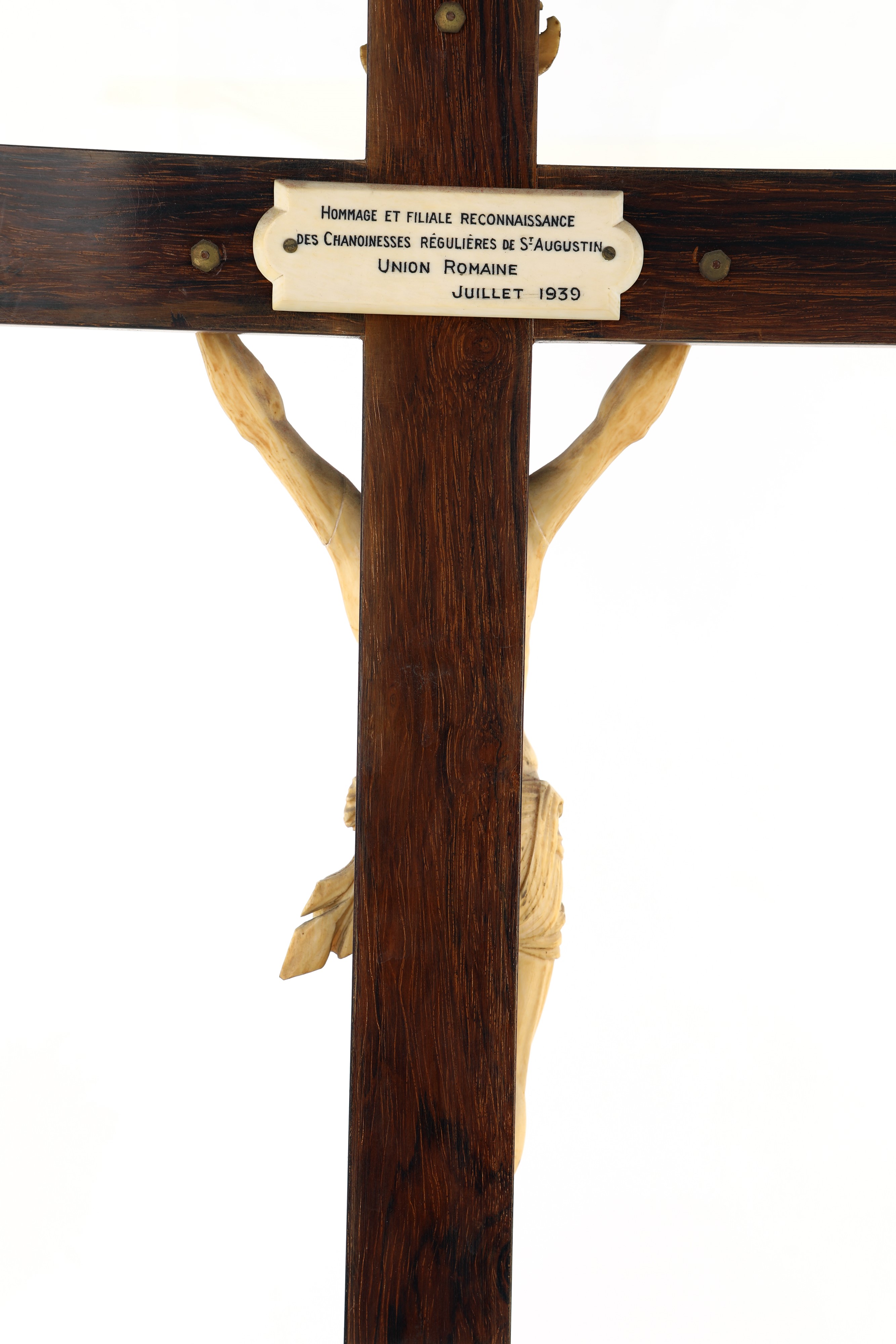 La scultura del Cristo, eretto sulla croce con gli occhi aperti (Christus crucifixus vigilans), è composta da tre parti unite tra loro, il corpo e le braccia; la testa è inclinata verso la spalla destra, la bocca è socchiusa e lo sguardo è rivolto verso l’alto; la folta capigliatura riccia, così come la barba, incorniciano il viso ricadendo sulle spalle. Il busto, teso nello sforzo, lascia emergere la definizione muscolare, mentre le gambe, anch’esse scolpite con attenzione per esaltarne la struttura, terminano con i piedi rigidi, posti uno accanto all’altro e inchiodati separatamente. Il perizoma è riccamente drappeggiato e si caratterizza per un ampio panneggio sorretto da un doppio cordone visibile sul lato sinistro ove ricade un drappo annodato. Sulla parte superiore della croce è presente il Titulus Crucis in avorio. Al verso etichetta con iscrizione in francese: "Hommage et Filiale Reconnaissance des Chanoinesses Régulières de St. Augustin Union Romaine Juillet 1939".