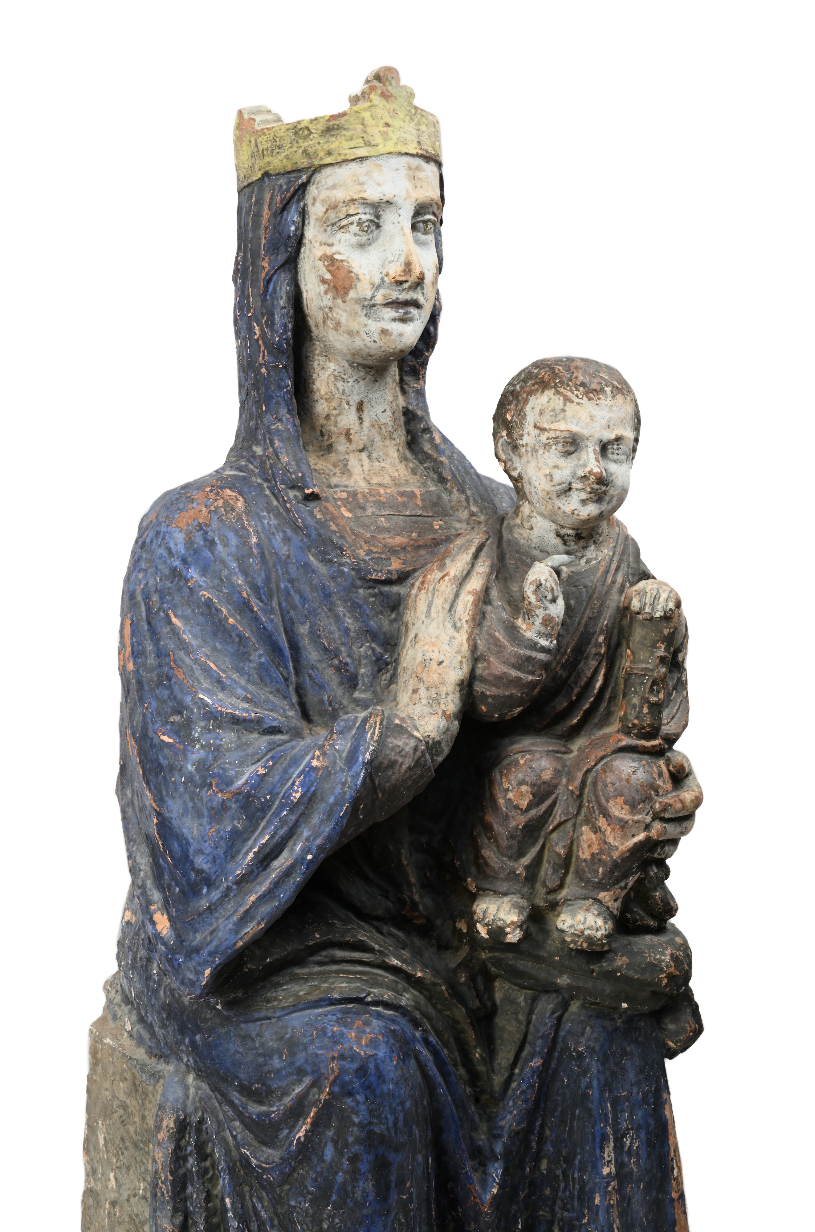 Maria è ritratta come una regina del Trecento, austera e composta, assisa in trono, avvolta in un lungo manto azzurro, con la testa velata e coronata come Regina e Signora del creato; Gesù Bambino appare con le sembianze di un legislatore romano, seduto sulle ginocchia della madre, con lo sguardo rivolto in avanti; nella mano sinistra tiene un cartiglio a simbolo dei dogmi di fede su cui si fonda la Chiesa e con la destra compie il gesto della benedizione. E' evidente la filiazione con il capolavoro in marmo di Arnolfo di Cambio e aiuti noto come "La Madonna dagli occhi di vetro", databile all'inizio del XIV secolo, proveniente dall'antica facciata di Santa Maria del Fiore e oggi conservato nel Museo dell'Opera del Duomo a Firenze.