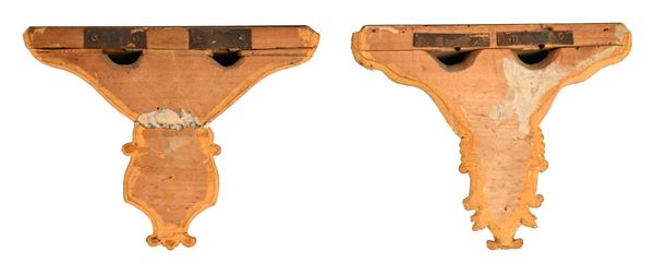 Due mensole a goccia in legno dorato, maiolica e porcellana dalle simili caratteristiche, XVIII secolo