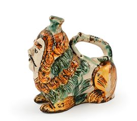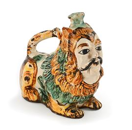 modellato a forma di leone con volto antropomorfo decorato nei toni del giallo/arancio, bruno, nero e verde ramina