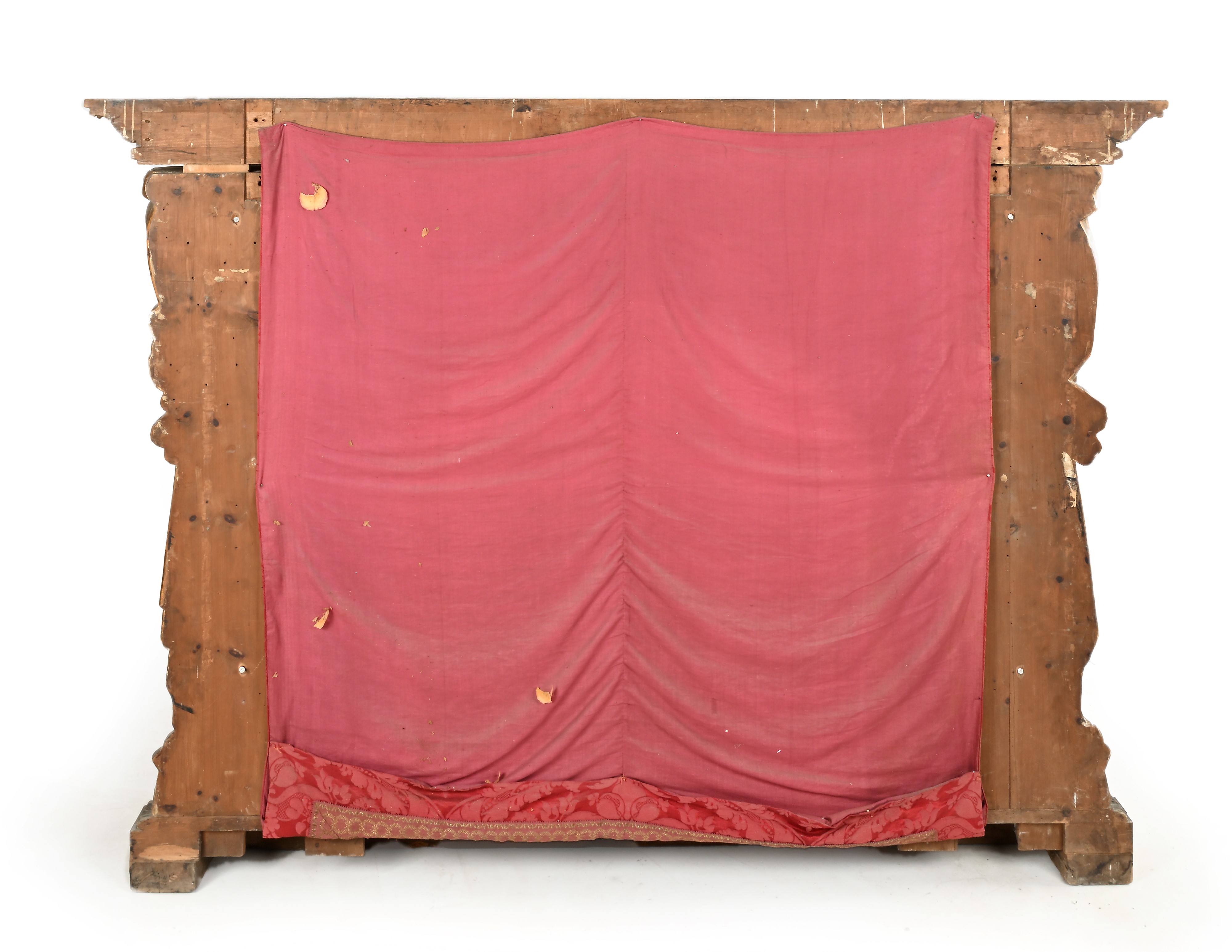 struttura architettonica con apertura ad arco decorato da rilievi vegetali, affiancato da figure laterali di telamone scolpite ed intagliate a tutto tondo poste come sostegno ideale della mensola superiore di linea sporgente e sagomata