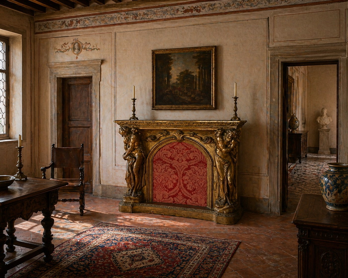 Grande mostra di camino barocca in legno scolpito, intagliato e dorato alla maniera di Andrea Brustolon, XIX secolo
