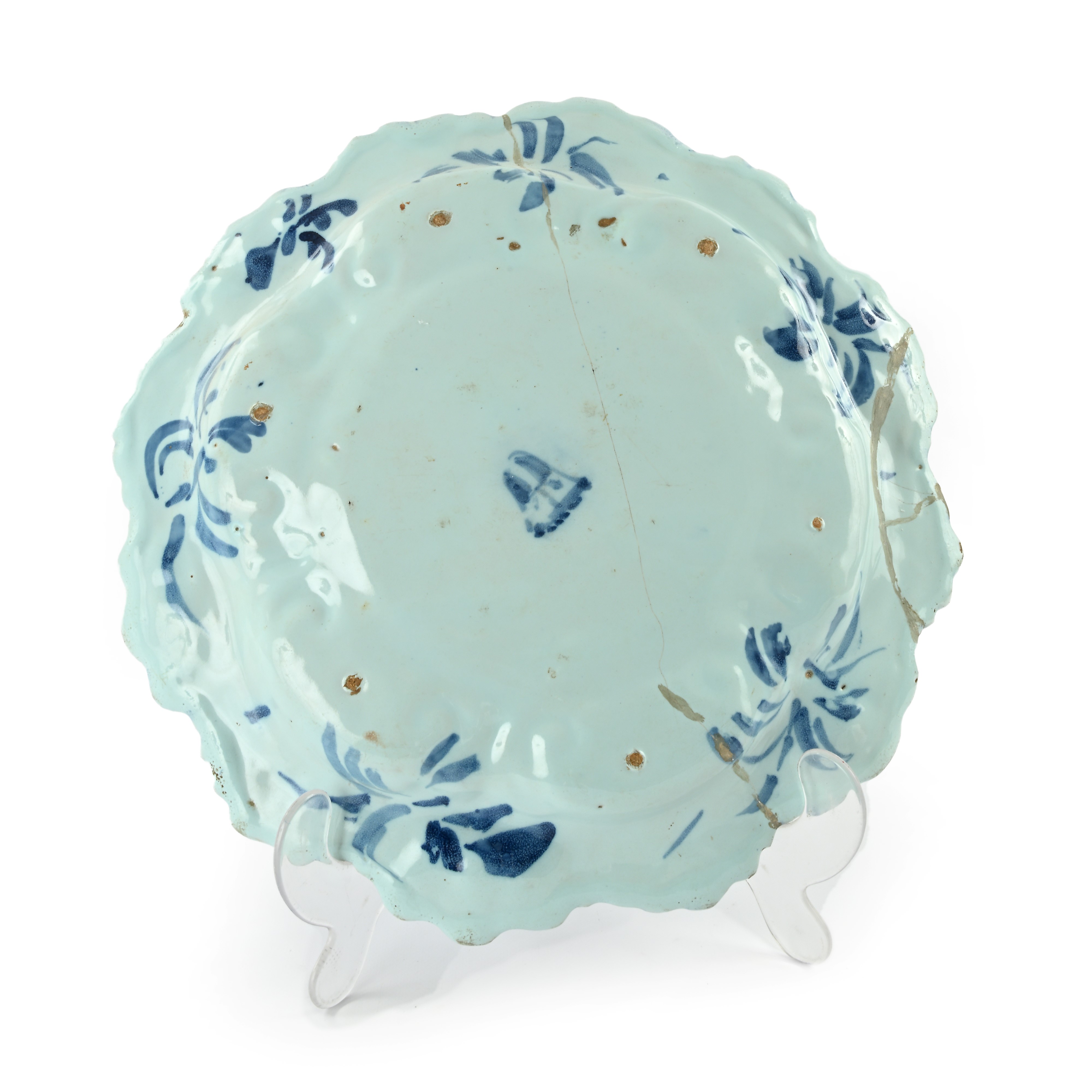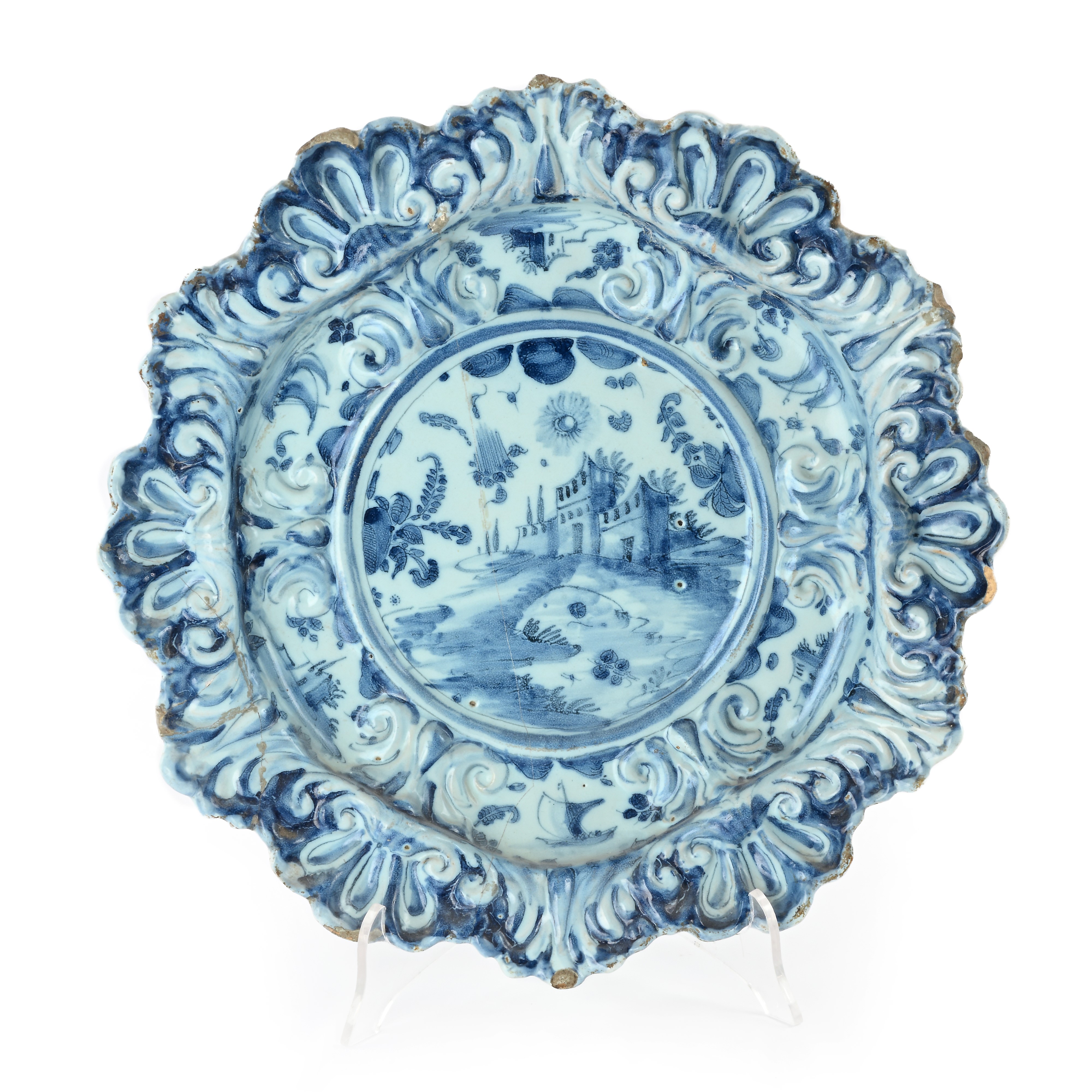decorato al centro da un paesaggio con castello; orlo frastagliato a simulare un corolla, con rilievi a conchiglia. Al verso stemma di Savona in blu e motivi vegetali stilizzati lungo il perimetro. Rotture e restauri