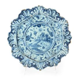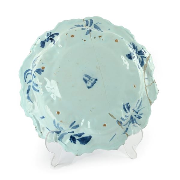 Grande piatto in maiolica decorato in blu su fondo berettino, Savona, fine XVII secolo