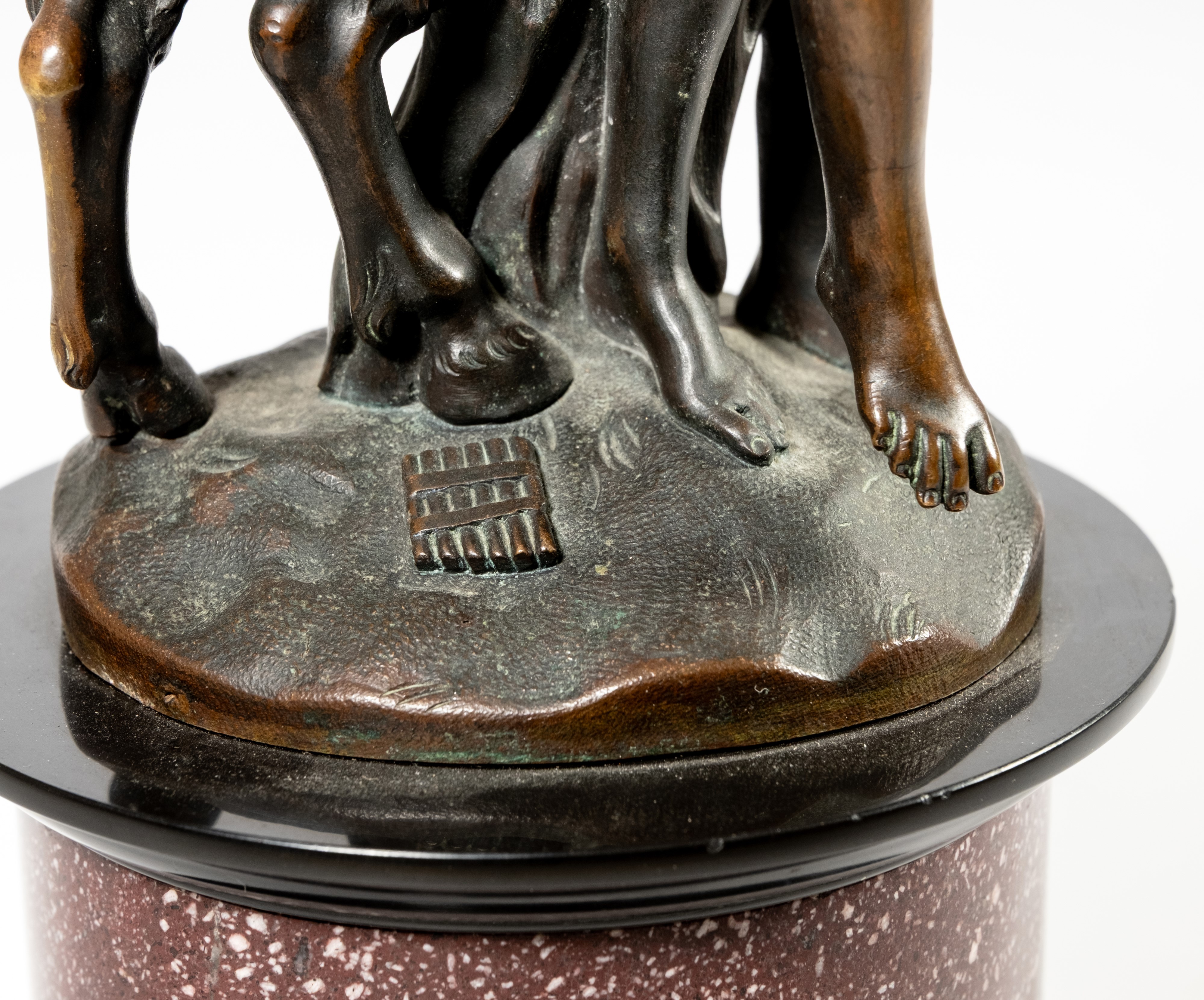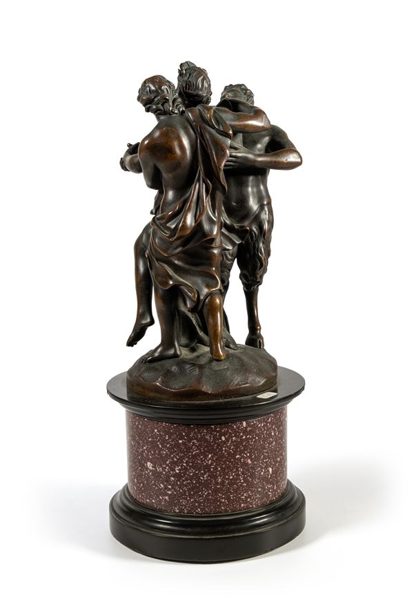 Gruppo in bronzo brunito raffigurante Apollo una ninfa ed un satiro, XIX secolo