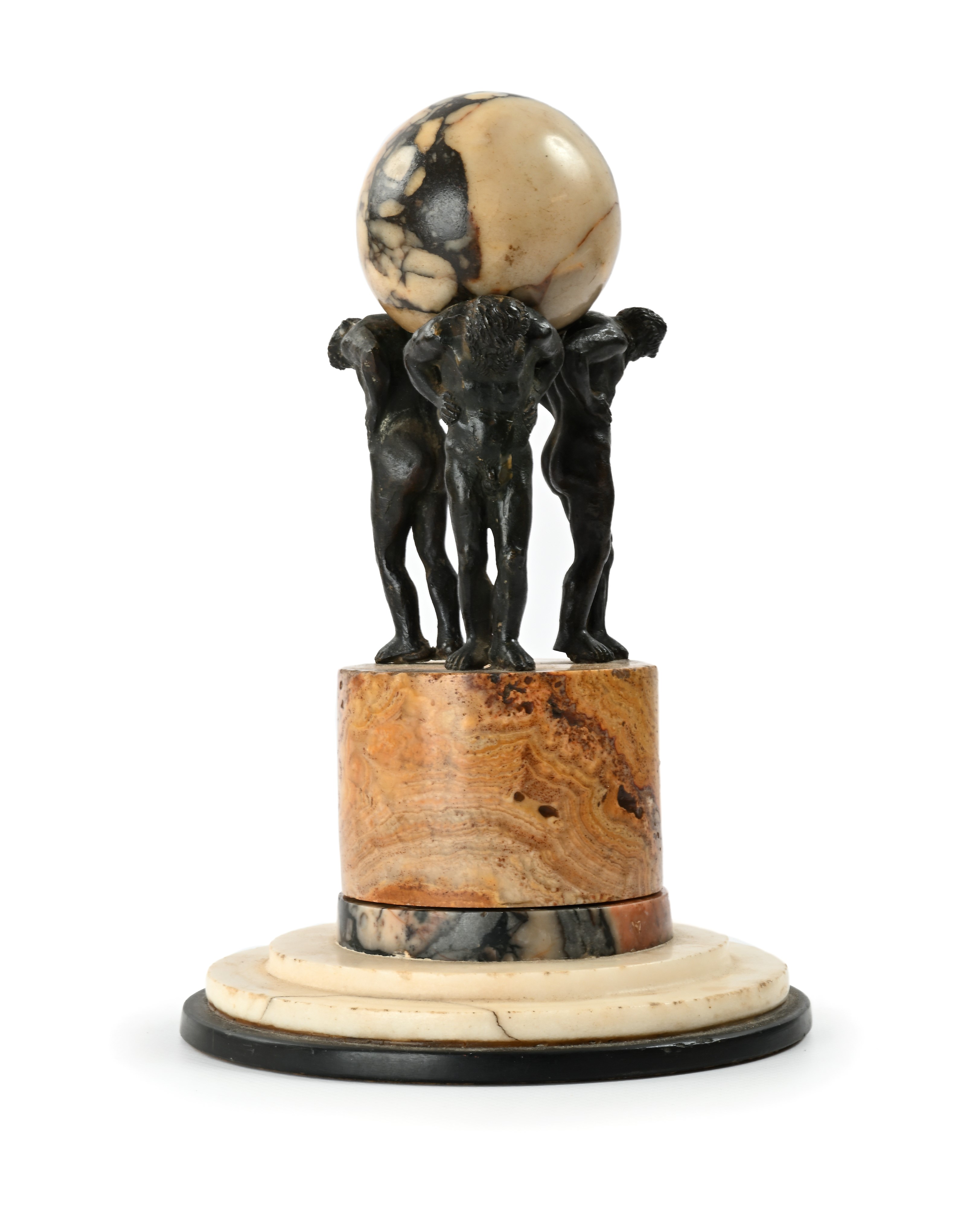 con tre figure di Atlante in bronzo disposte in modo circolare a sostegno di una sfera, su piedistallo cilindrico e base circolare gradinata