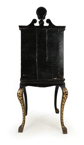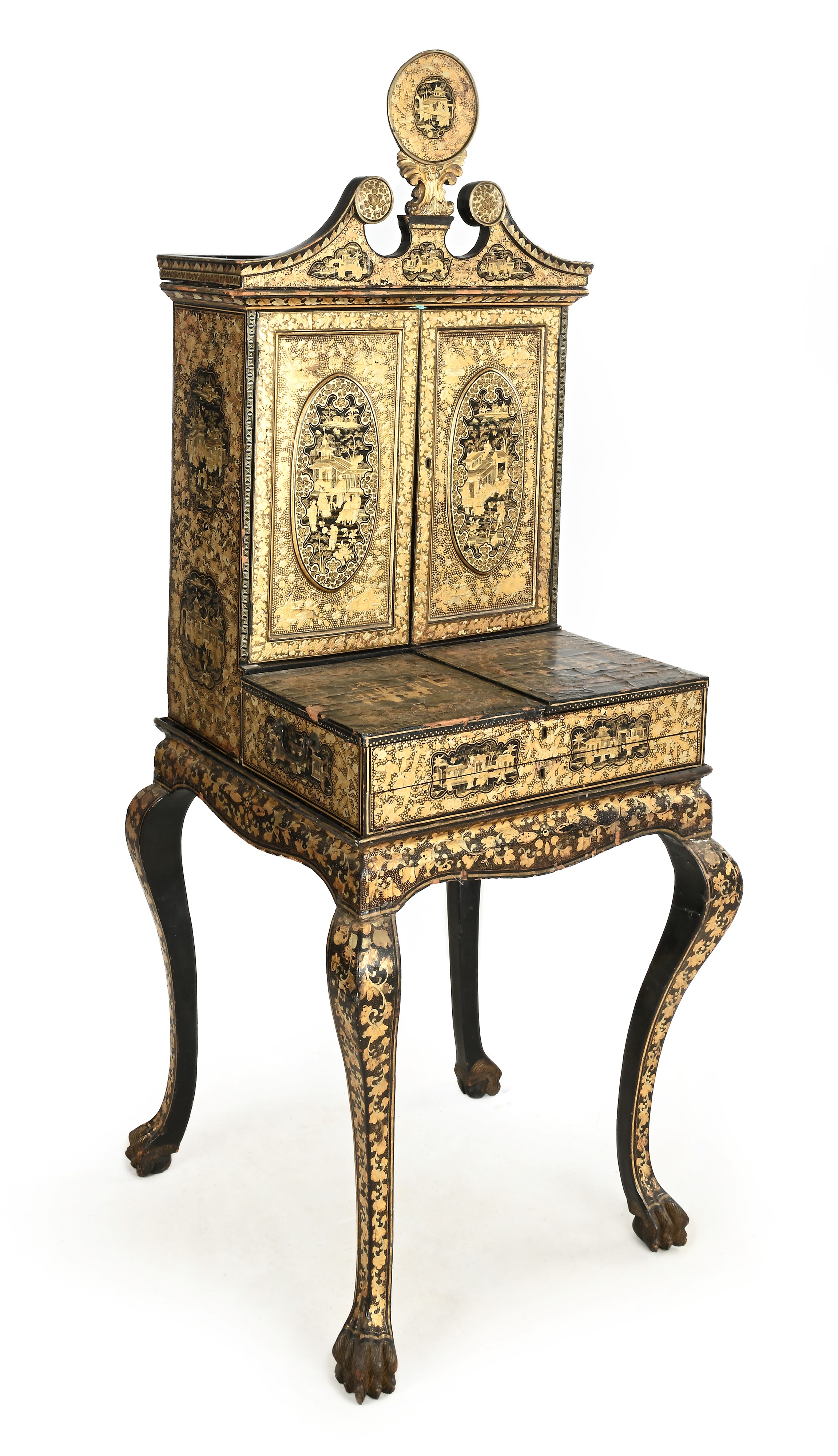 con fitta decorazione a chinoiséries dorate in forma di scene di genere minuziosamente dipinte circondate da composizioni naturalistiche. Il corpo superiore poggia su un tavolino con gambe sagomate ed è dominato da cimasa a timpano spezzato centrato da motivo ornamentale circolare; reca due sportelli con due antine a specchio interne di diversa misura circondate da due scomparti e sei tiretti diversi; sulla parte anteriore dal tavolo poggia una "boîte à couture" con piano apribile a libro; all'interno una struttura estraibile con nove scomparti per utensili vari e quattro sezioni con copertura ed un cassetto laterale. Difetti