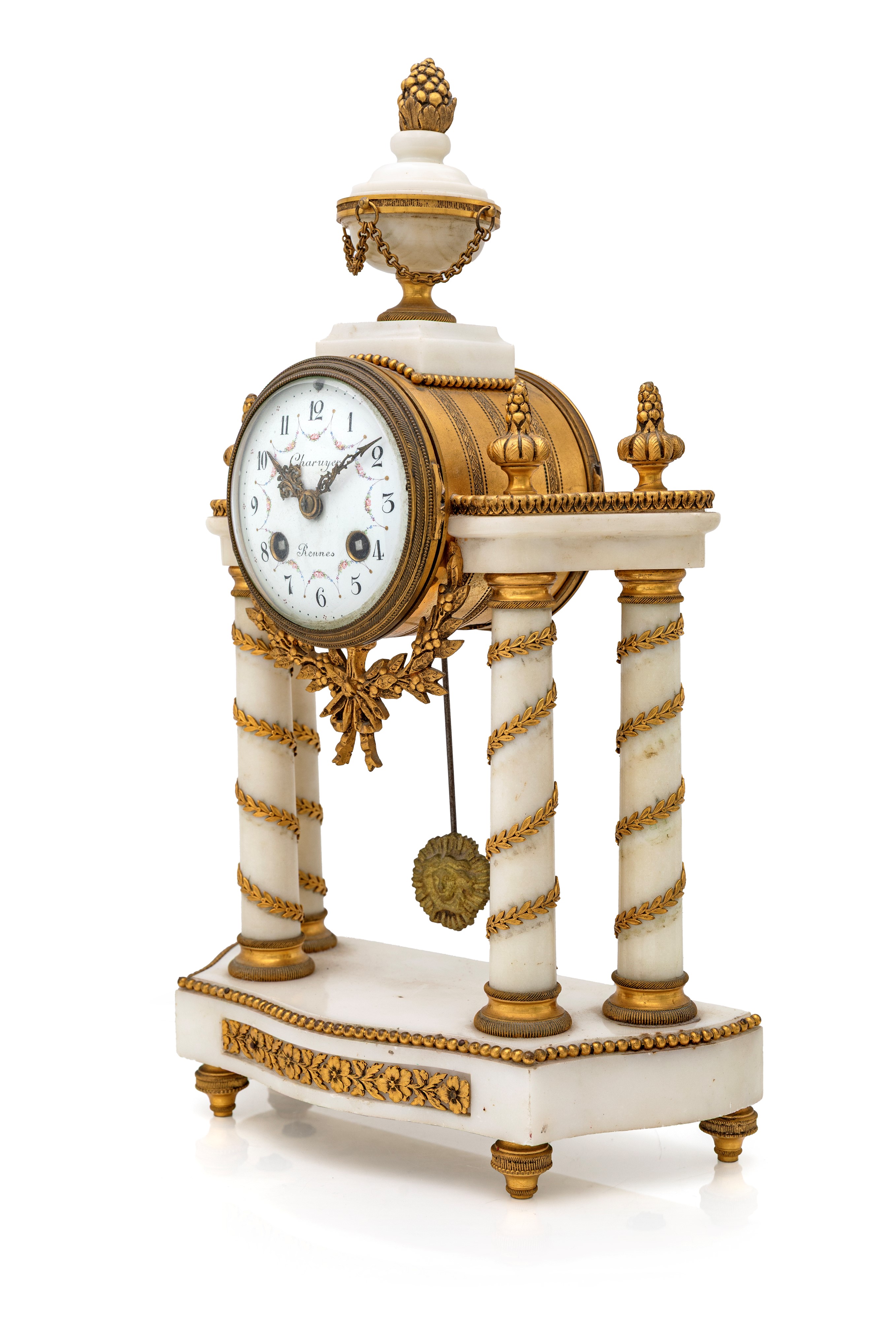 struttura a tempio rifinito lungo il perimetro da perline, con colonne impreziosite da applicazioni in bronzo dorato in forma di serto ad andamento elicoidale; sommità decorata da una coppa dominata da pigna in bronzo, quadrante circolare a due fori di carica con indicazione oraria a numeri arabi parzialmente incorniciati da ghirlande di fiori variopinti, firmato "Charuyer Rennes"