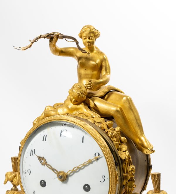 cassa circolare circondata da una ghirlanda in rilievo, sorretta da figure di chimera come sfinge e sormontata da Venere e Cupido; quadrante a due fori di carica e indicazione oraria a numeri arabi, base rettangolare impreziosita da fregi in bronzo; piedi a trottola