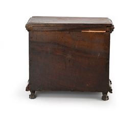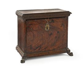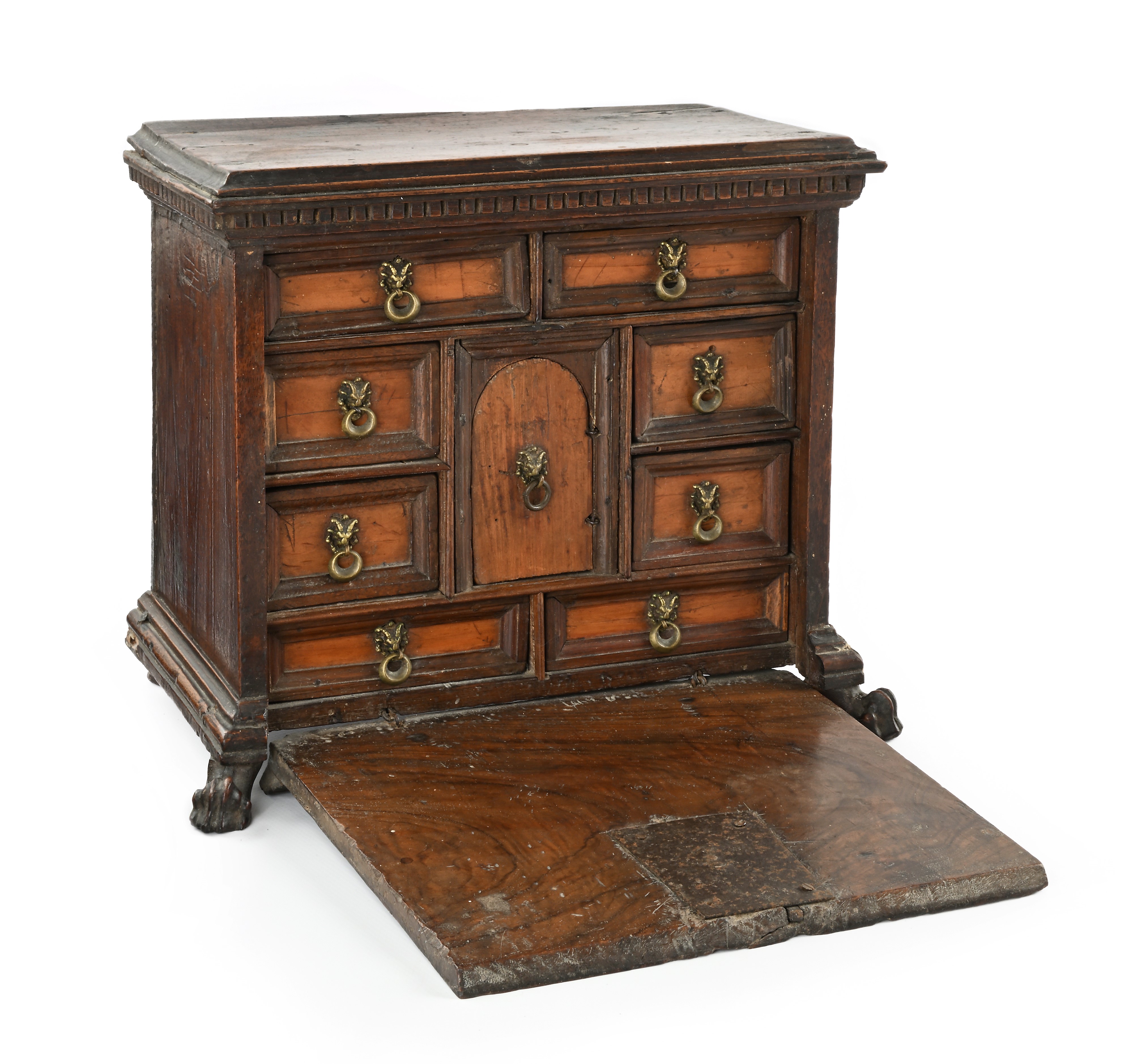 di forma squadrata poggiante su piedi ferini, reca facciata con anta a ribalta che cela un piccolo sportello centinato centrale circondato da otto tiretti con piccole maniglie ad anello su protomi zoomorfe