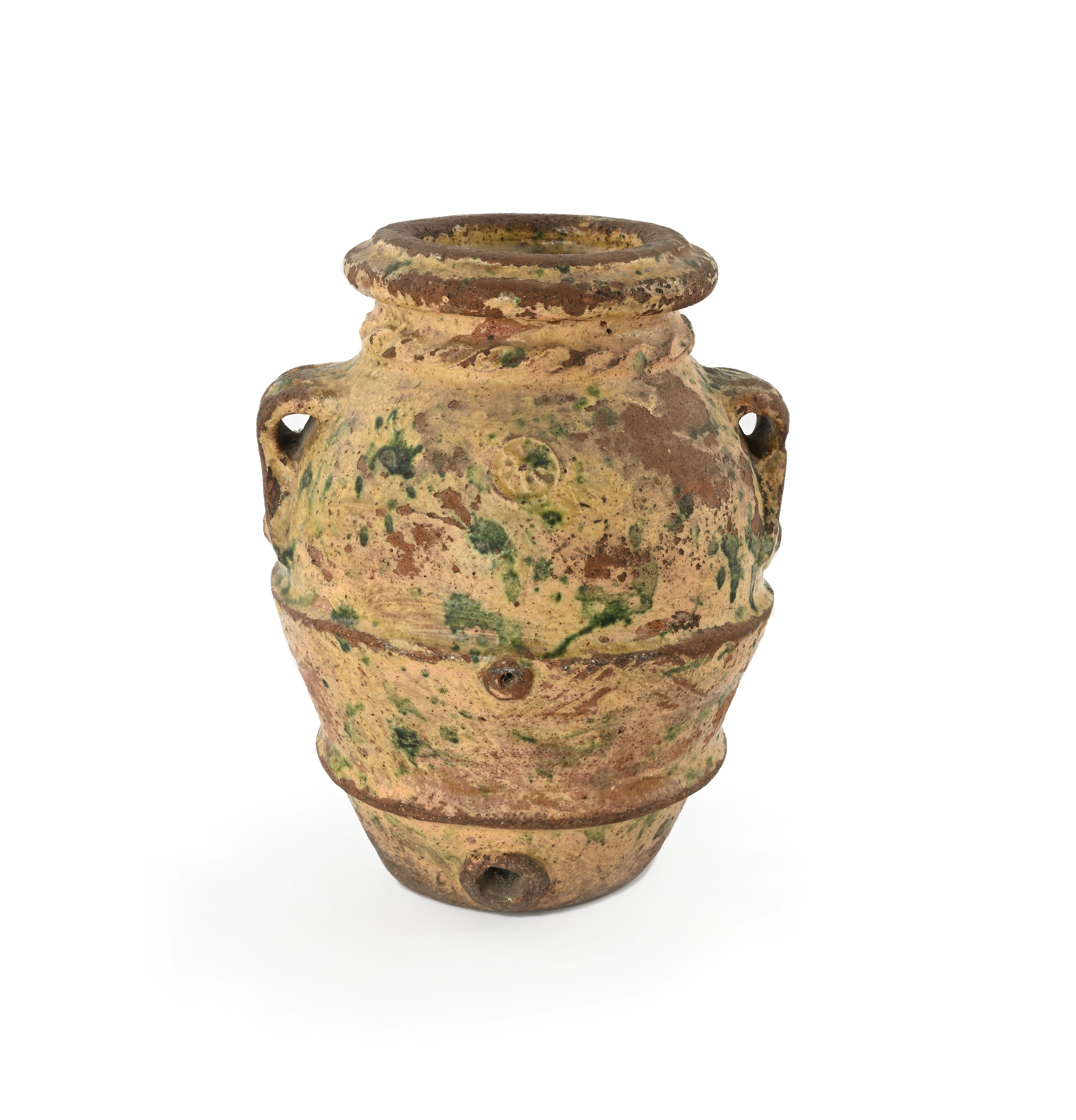 Piccolo orcio in terracotta a macchie verdi su fondo giallo, XIX secolo