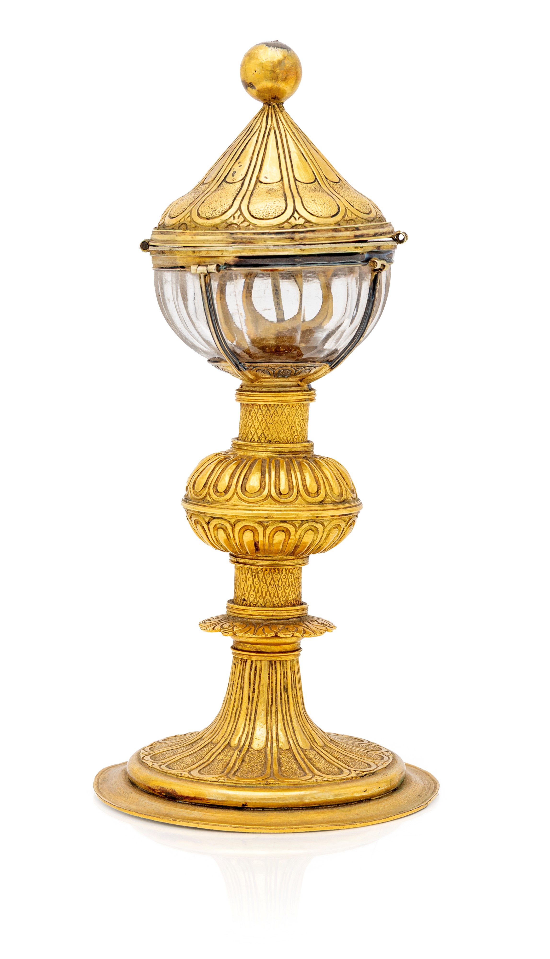 con coppa in vetro (rotta) e sostegno interno per l'esposizione dell'ostia consacrata; coperchio a cupolino incernierato sormontato da una piccola croce dissaldata; stelo composito inciso con grande nodo baccellato e piede circolare
