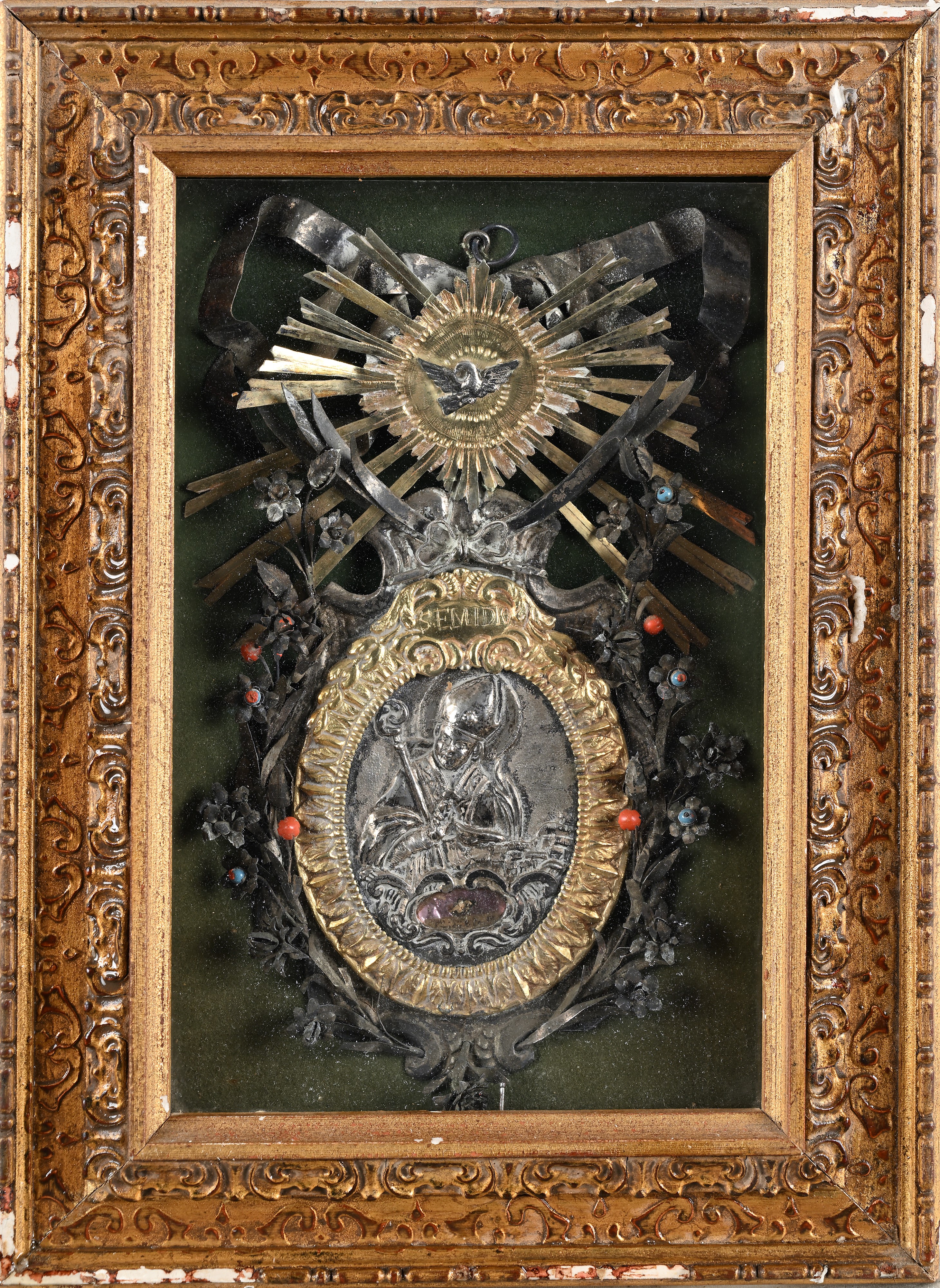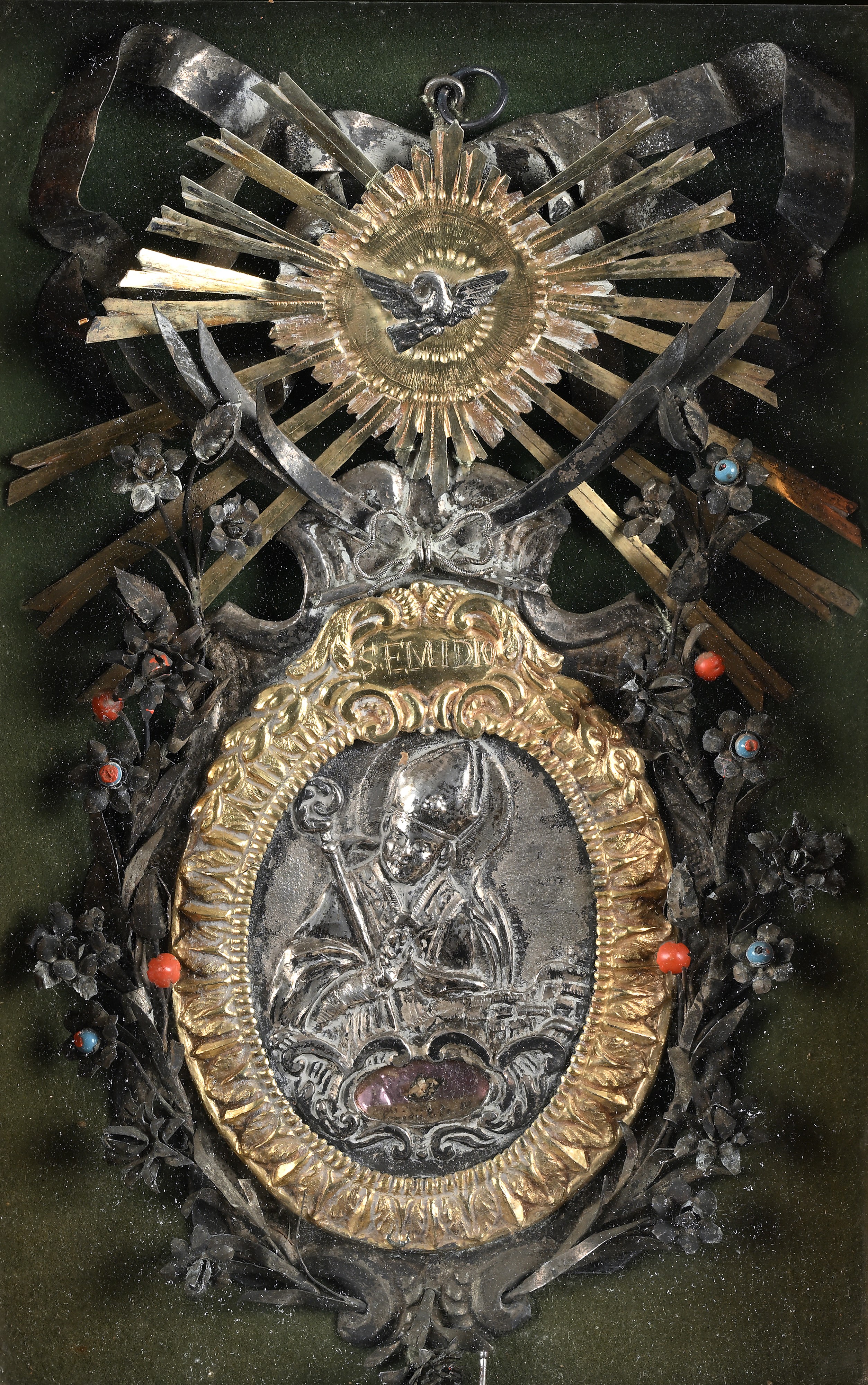 medaglione ovale con Santo Vescovo ritratto a mezzo busto in posa orante sotto il quale si apre una nicchia portareliquia. Cornice a palmette con cartiglio sulla sommità e iscrizione "SEMIDIO" sormontato dalla colomba dello Spirito Santo entro raggiera; l'insieme è arricchito da esili steli fioriti con inserti colorati. Non esaminato fuori dalla cornice.
