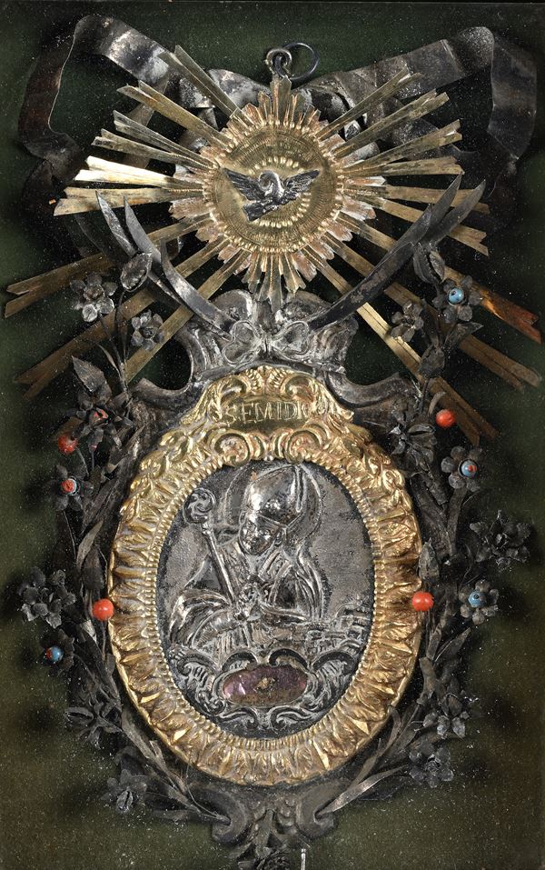 Placca devozionale in argento sbalzato e metallo dorato, XVIII secolo