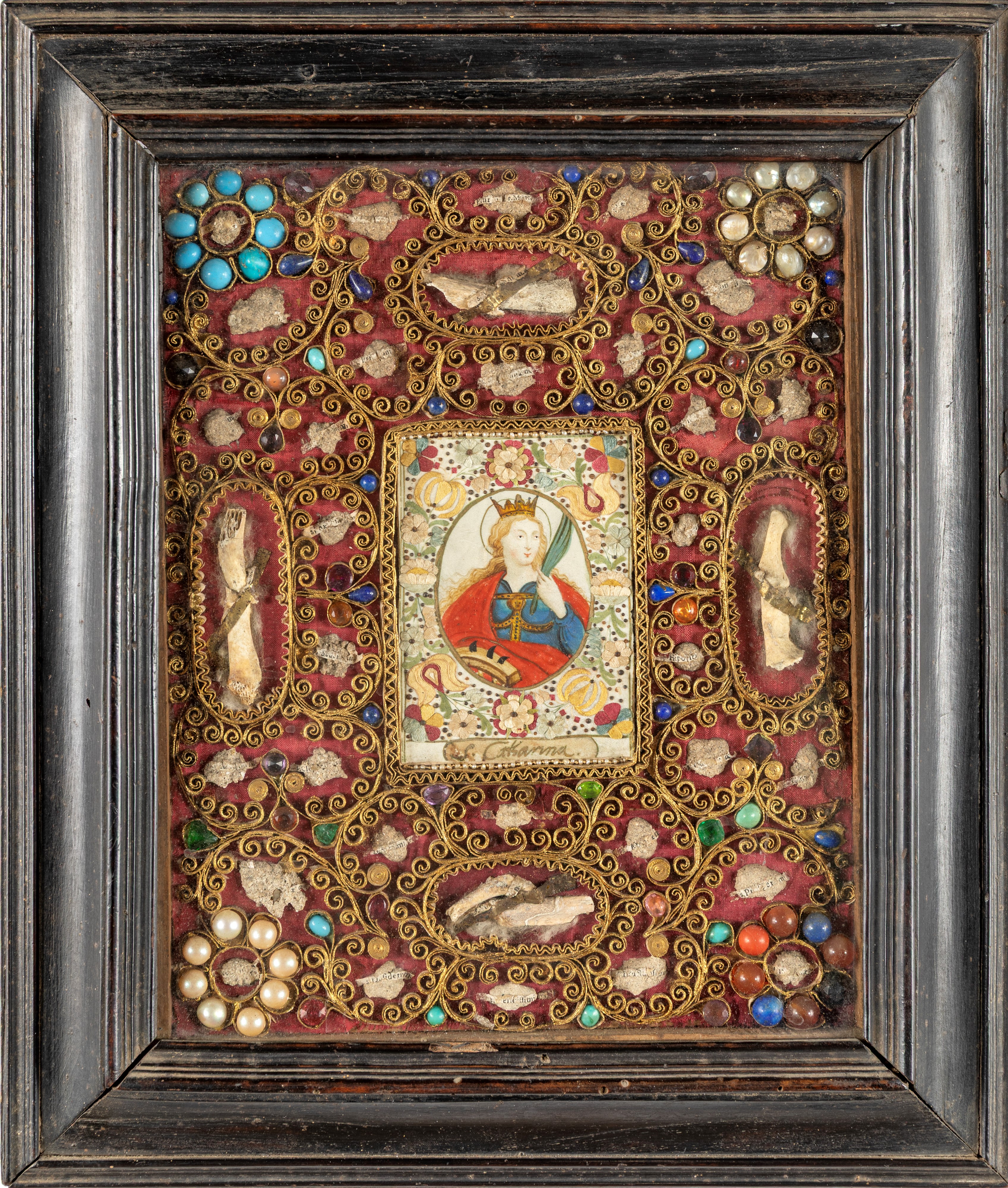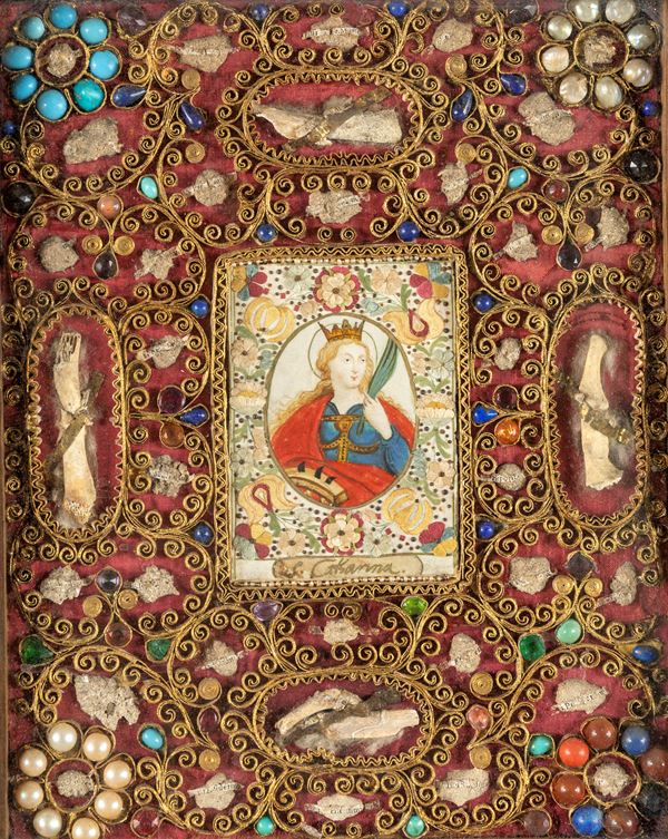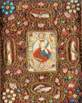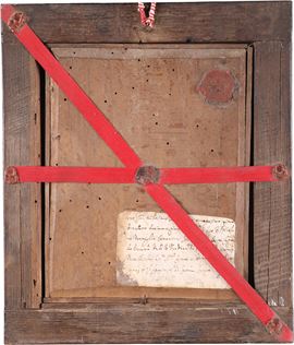 l'immagine centrale è circondata da elaborati lavori in "papier roulé" arricchiti da gemme variopinte, perline ed altri elementi ornamentali. Cornice modanata in legno ebanizzato. Al verso della tavola, etichetta cartacea manoscritta e sei timbri in ceralacca rossa