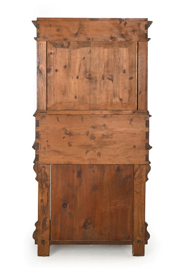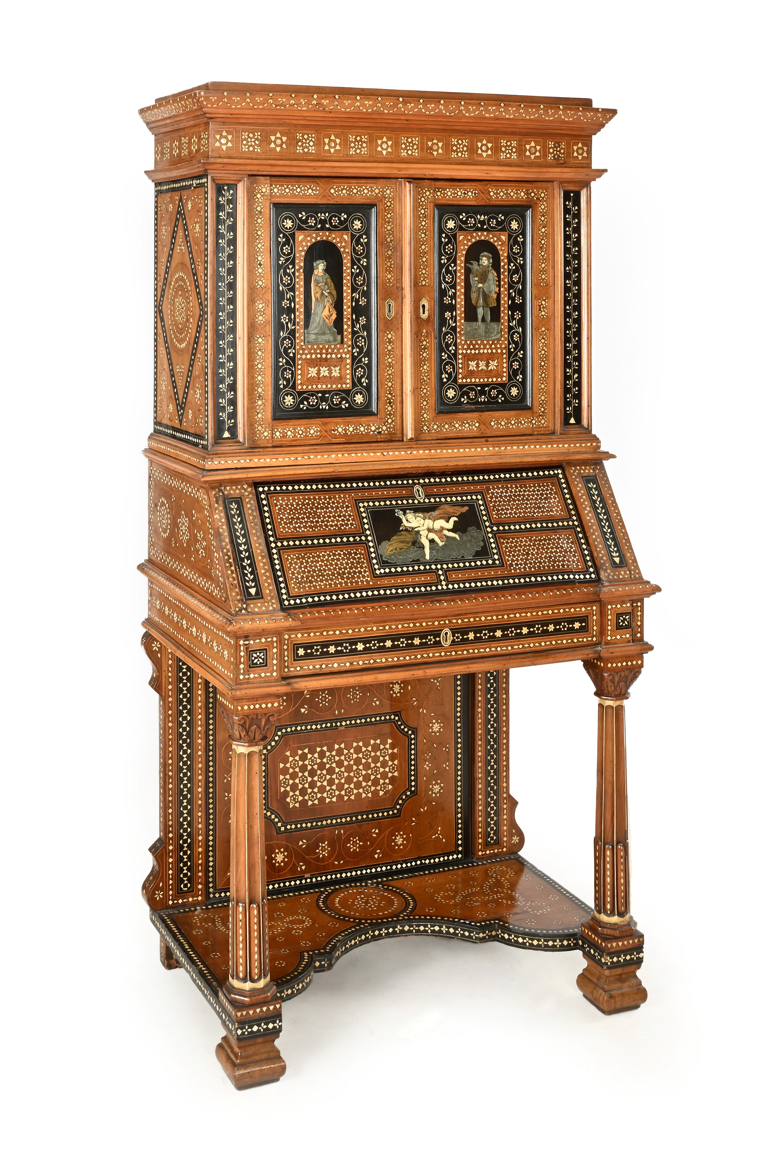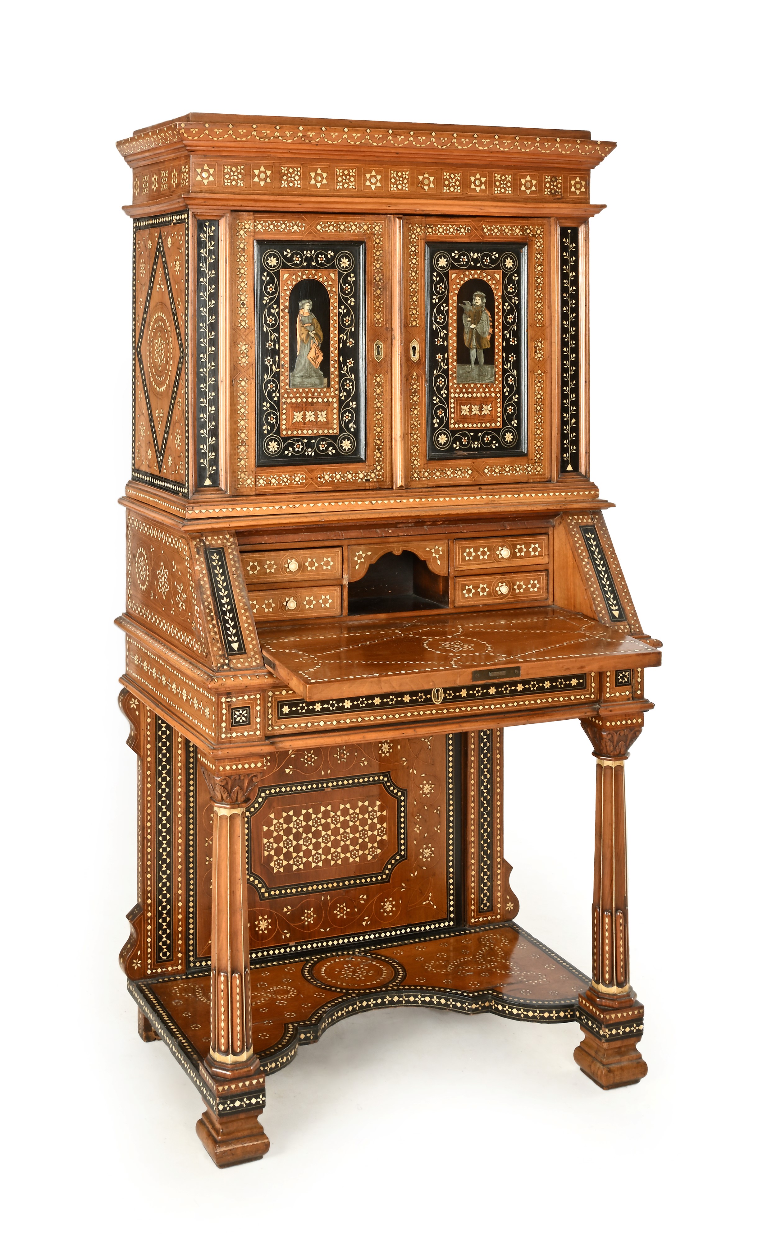 interamente decorato a motivi geometrici, sinuosi sottili steli con corolle stilizzate, figure in abiti rinascimentali e mitologiche; due sportelli nella parte superiore, la ribalta cela un vano centrale centinato e due cassetti in colonna disposti ai lati; gambe anteriori a forma di colonna scanalata su base sagomata; piedi squadrati modanati.