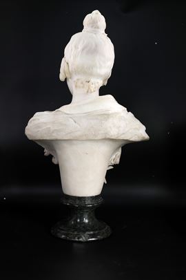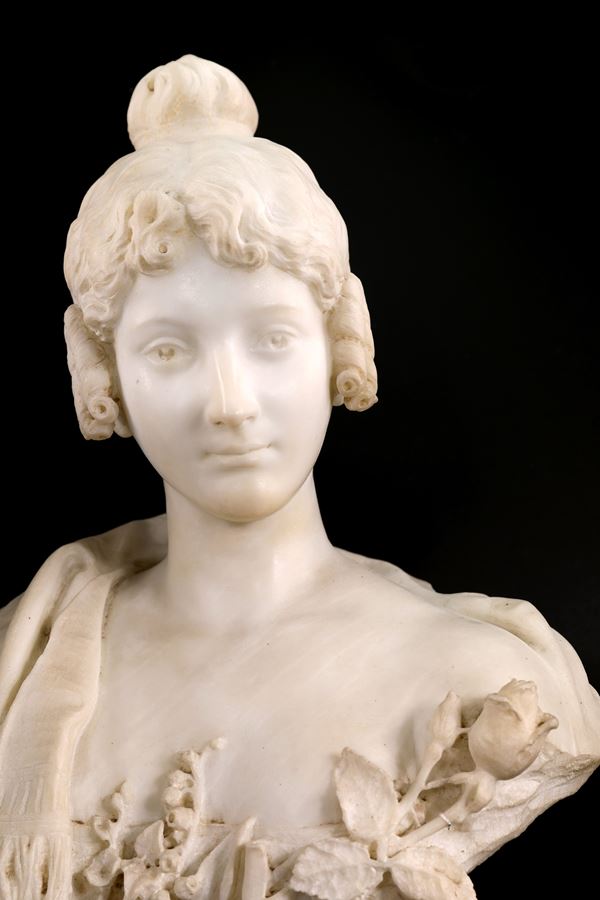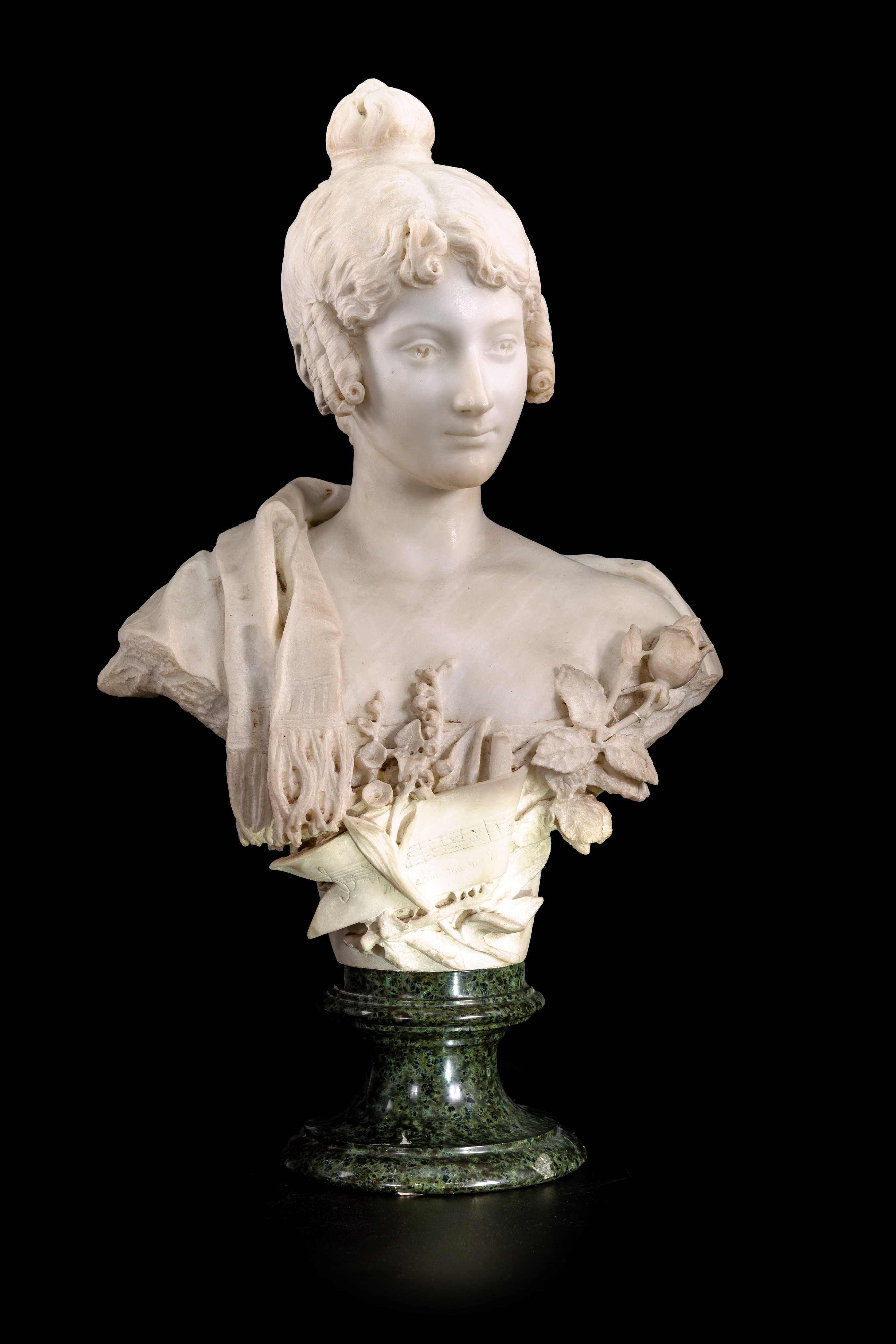 caratterizzata da rami recisi di rose e convolvoli a trattenere idealmente uno spartito musicale; piedistallo a rocchetto in marmo verde di Prato. Firmata e datata al verso "G. Maranghi / Firenze 1910"