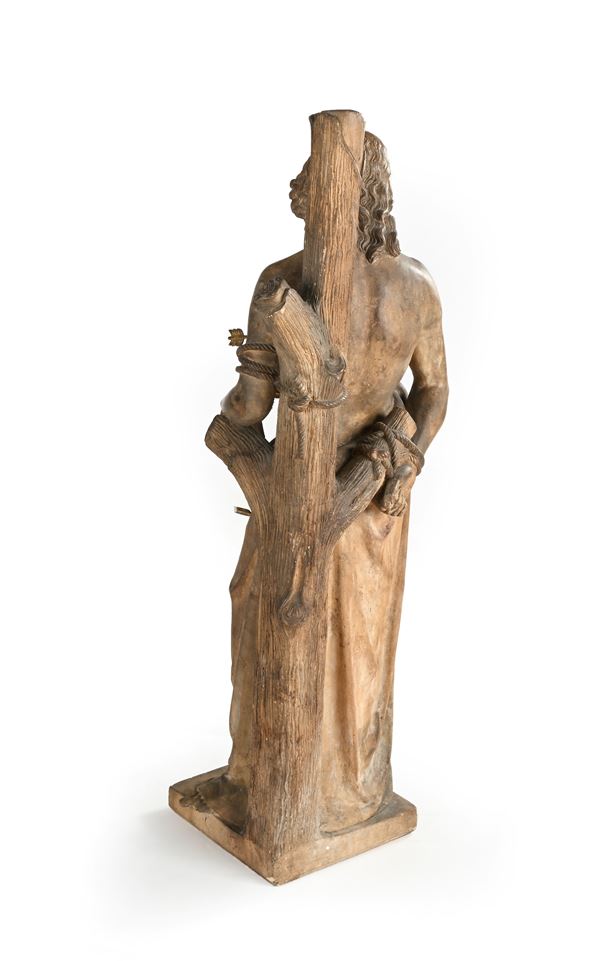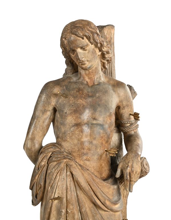 Il Santo è raffigurato durante il suo martirio secondo un'iconografia classica, col braccio sinistro piegato posato su un tronco di ramo d'albero, il destro piegato dietro la schiena e legato ad un ceppo. La postura richiama la statuaria antica (cfr. l'Apollino) e sul corpo sono presenti frecce con impennaggio, prive di punta ed estraibili, realizzate in metallo dorato. Lievi mancanze (alluce sinistro)