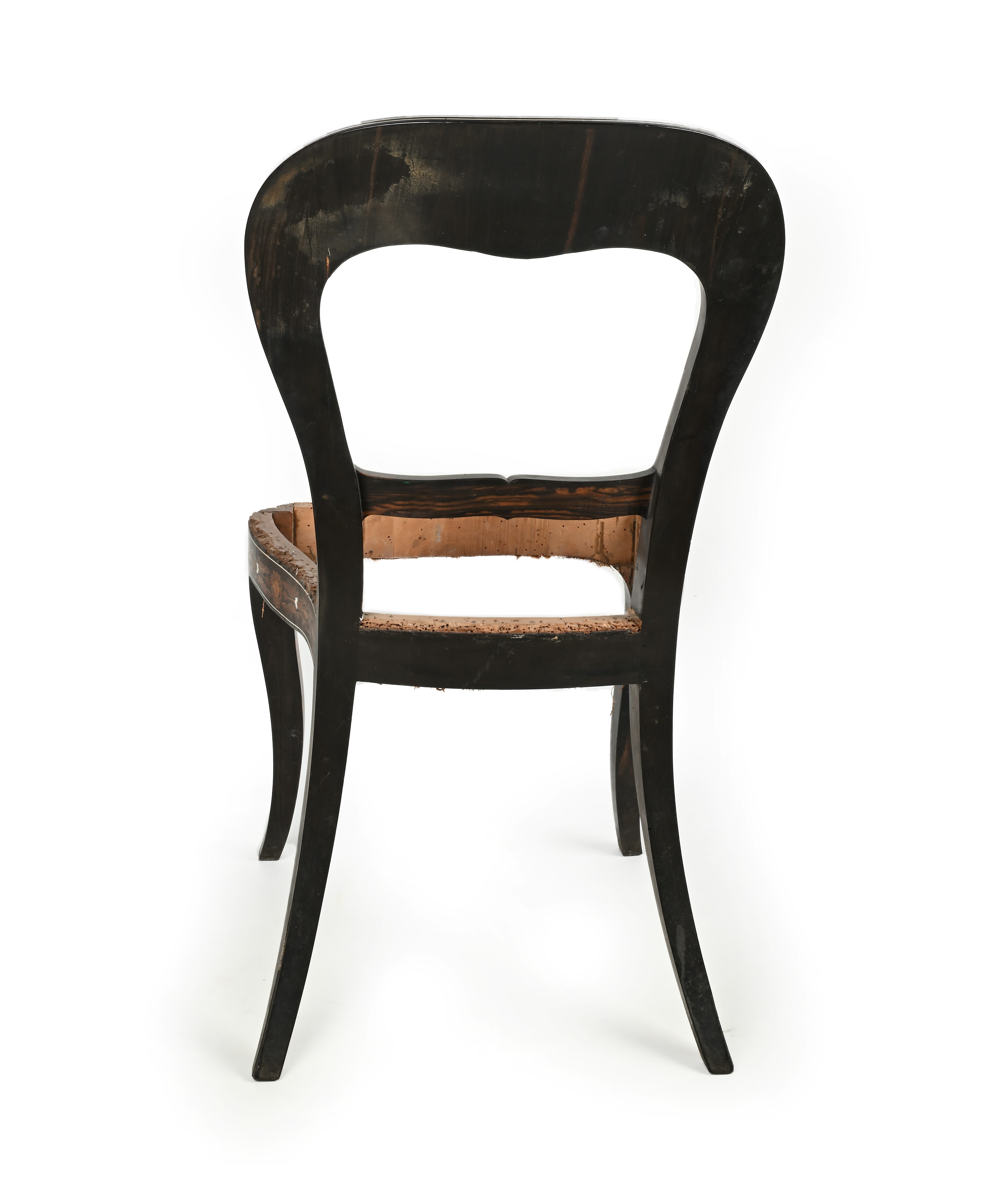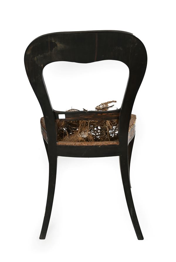 schienale a giorno con spalliera centrata da un vaso da cui si diramano esili tralci curvilinei con motivi vegetali incurvati; sedile privo di imbottitura, gambe anteriori sagomate, posteriori sfuggenti