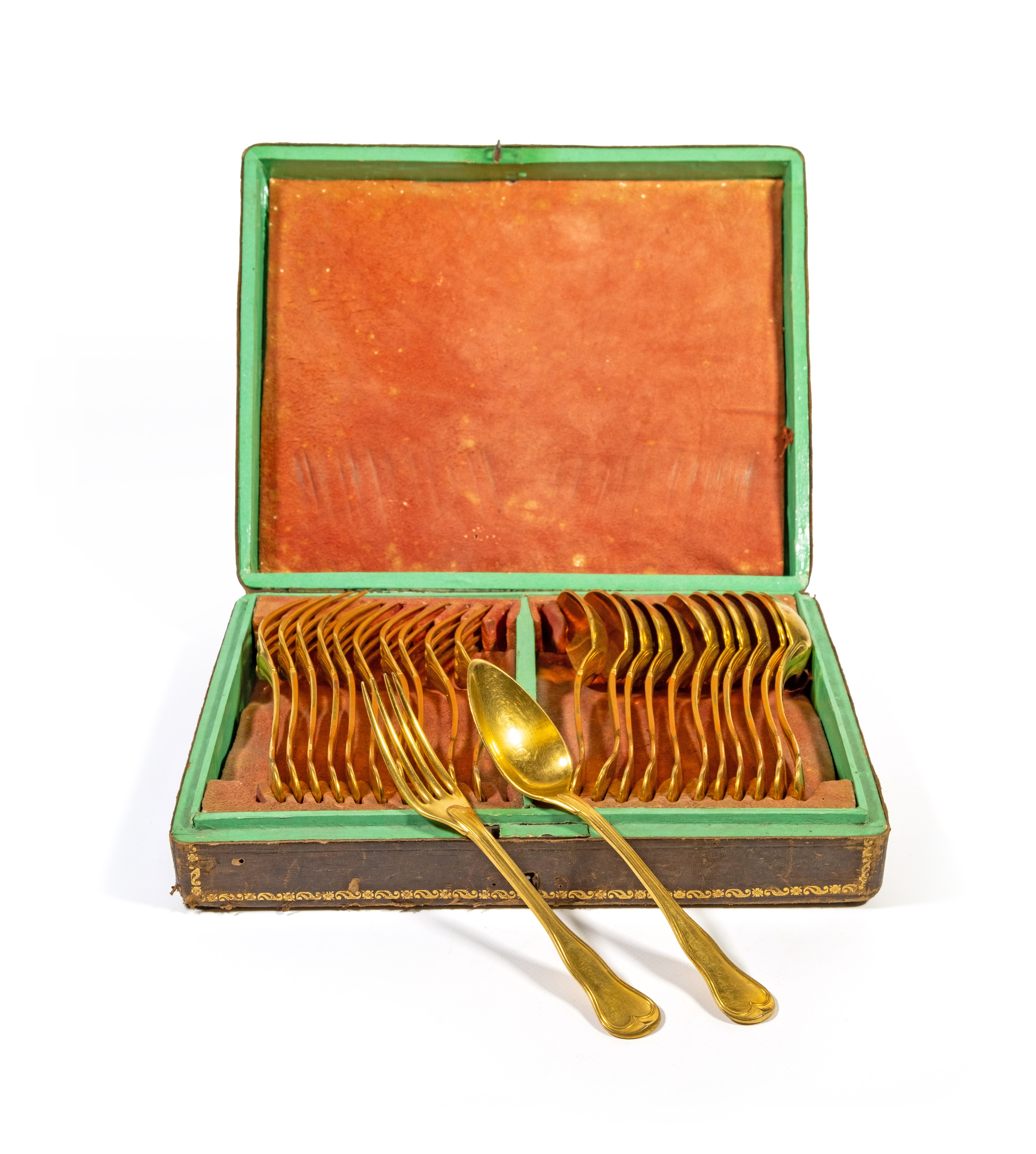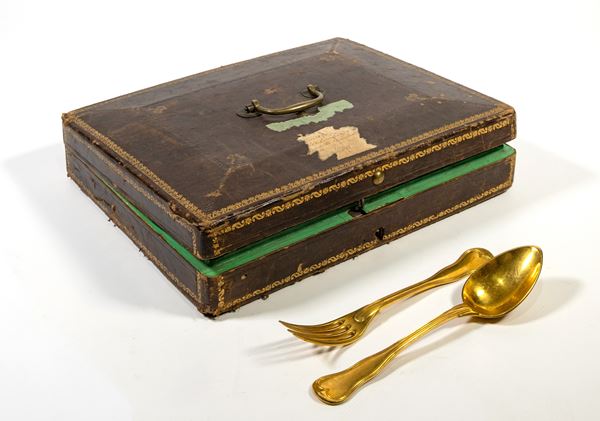 Servizio di posate da dolce in metallo dorato, entro scatola
