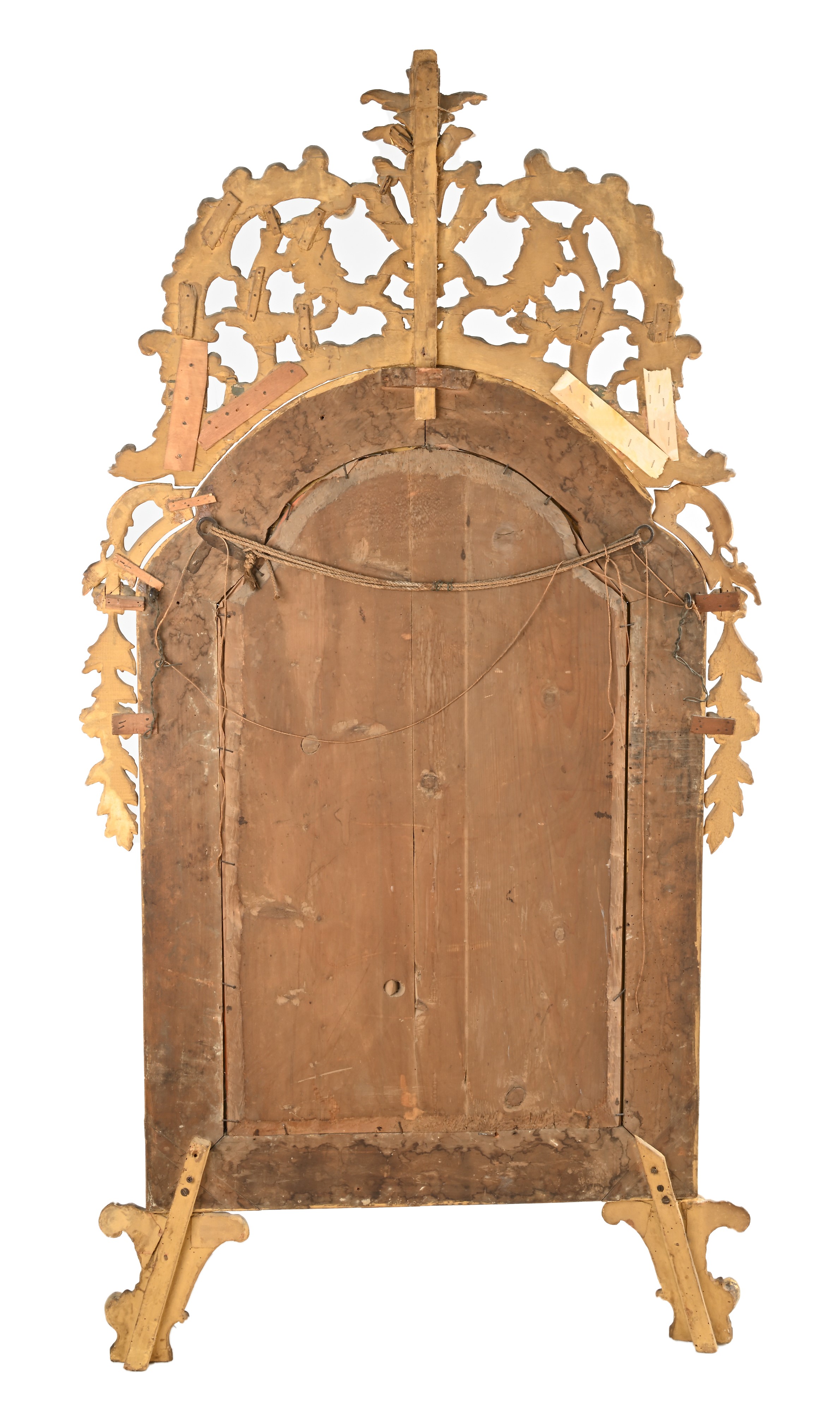 cornice centinata con arco sottolineato da un motivi a nastro pieghettato su cui si innalza la cimasa dominata da un pennacchio affiancato da volute vegetali, cartigli e cascatelle. Restauri alla doratura