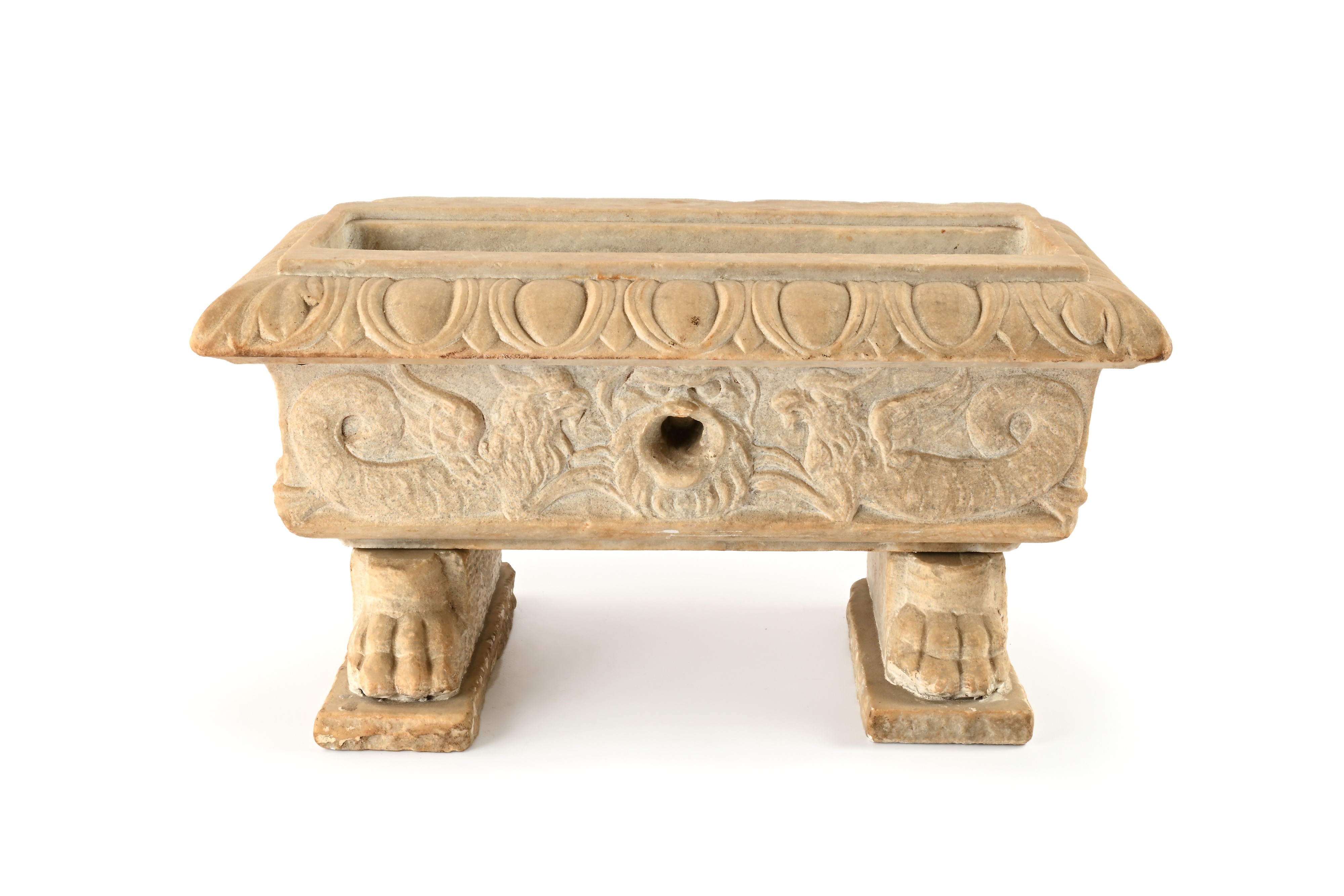 di forma rettangolare decorata da grifoni contrapposti ad affiancare un mascherone centrale con foro passante; ciglio spiovente percorso da ovoli, sostegni scolpiti frontalmente come zampe ferine