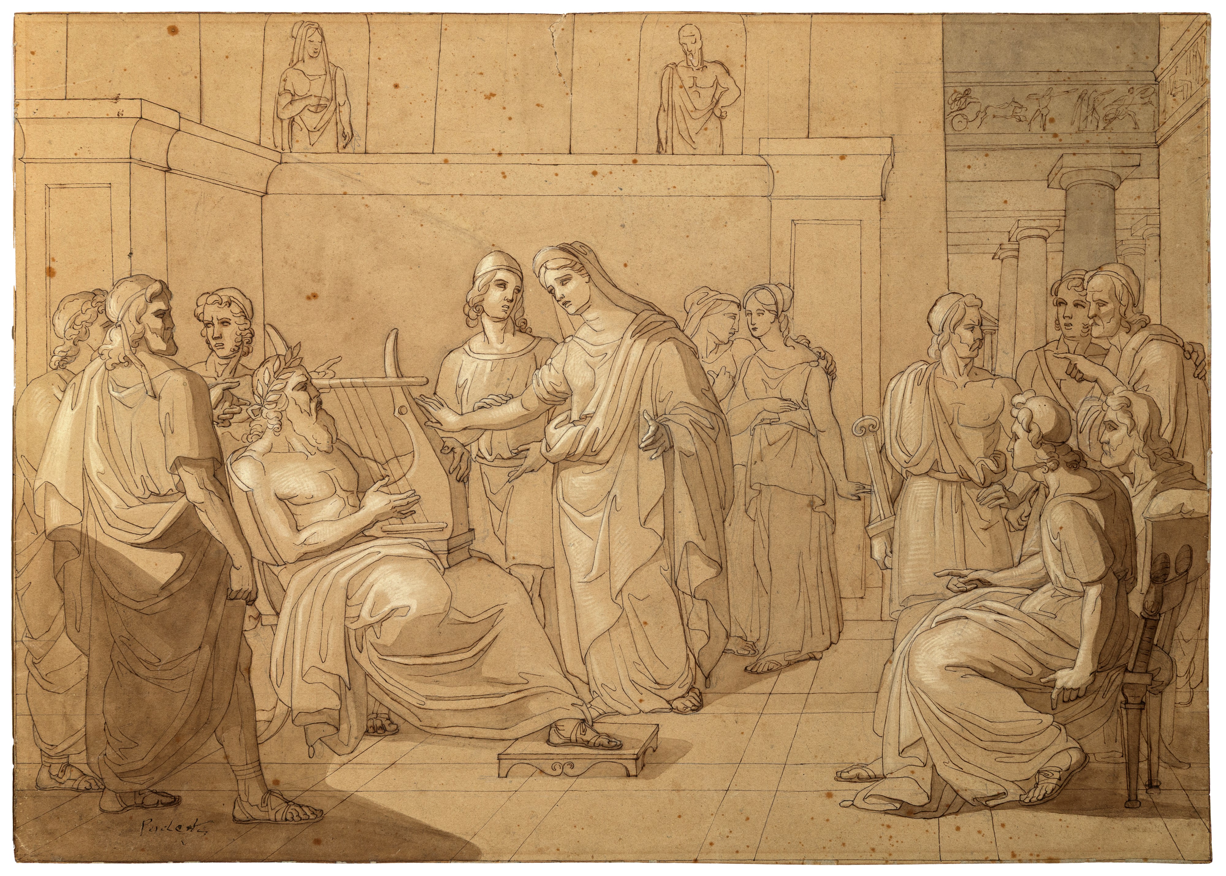 penna, inchiostro bruno e inchiostro acquerellato con rialzi di biacca e pietra nera su carta