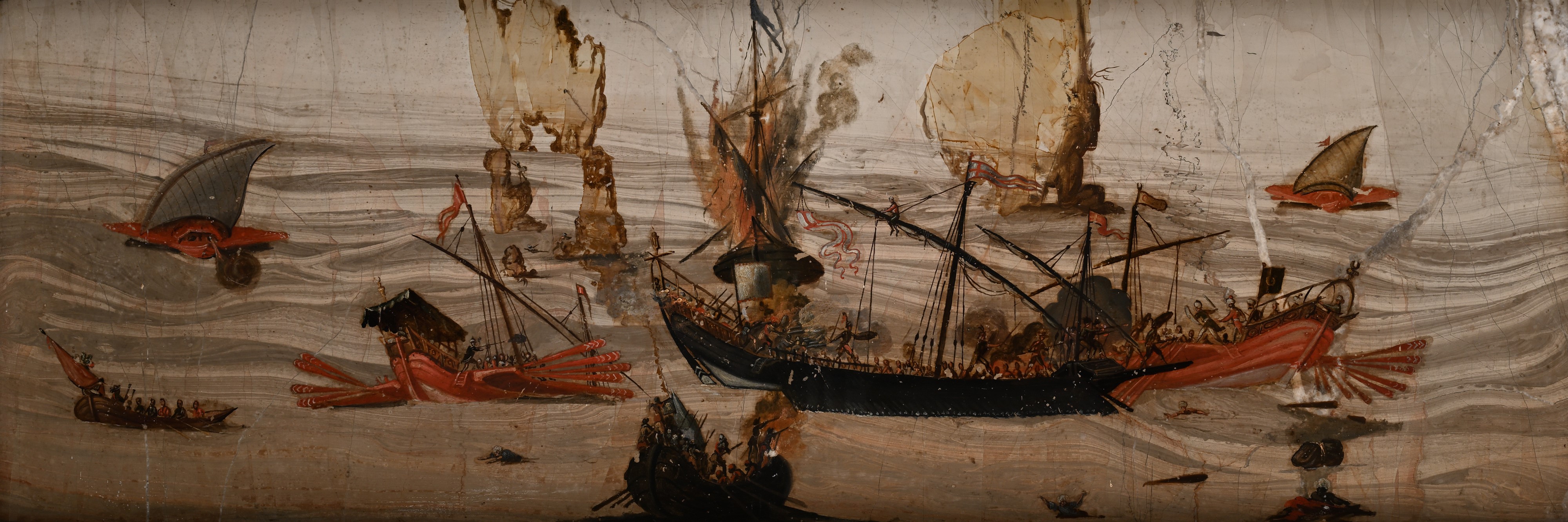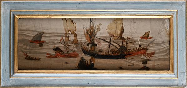 Il dipinto qui in esame raffigura una battaglia navale dipinta su una tipologia di pietra paesina detta