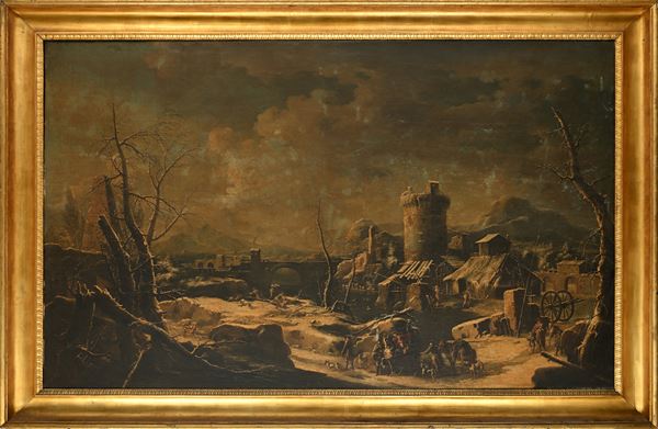Paesaggio innevato raffigurante un villaggio con torre e figure
