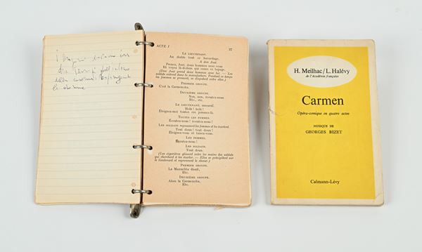2 copie del Libretto della Carmen di Georges Bizet, ambedue con note di regia di Mauro Bolognini che la rappresentò a Milano al Teatro alla Scala il 17 gennaio 1972 e a Verona all'Arena nell'agosto 1984