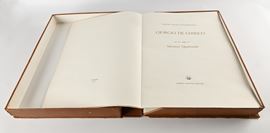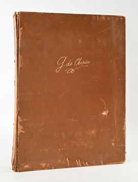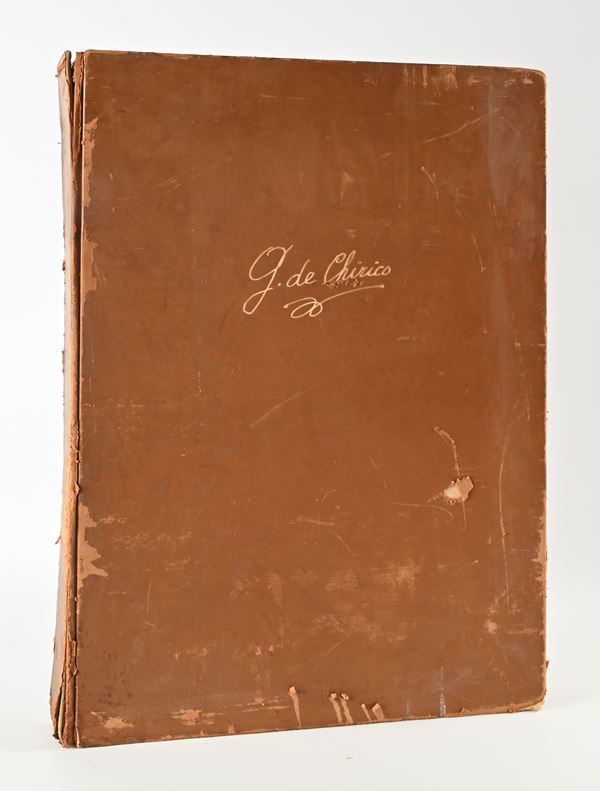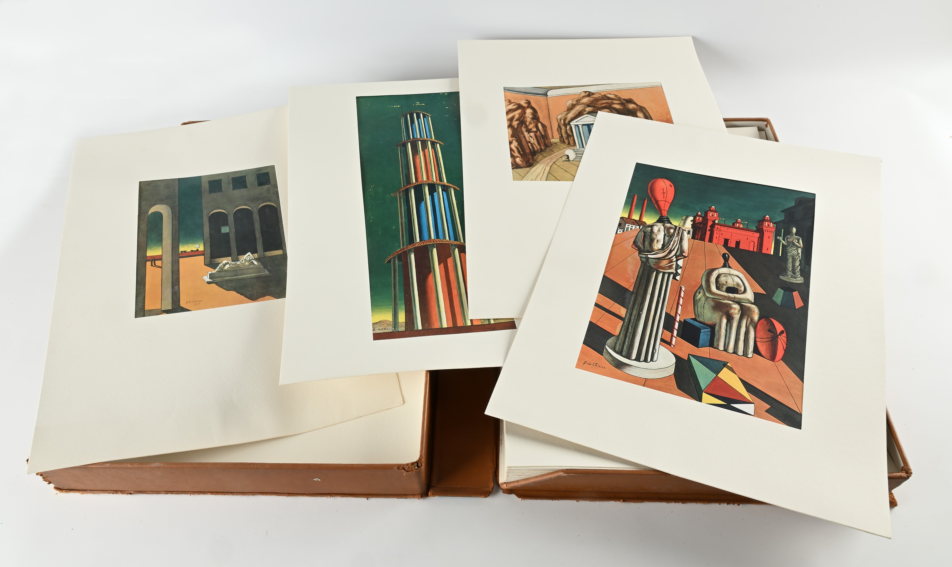 Cartella originale in piena pelle con 40 più 1 riproduzioni litografiche di opere di De Chirico. Difetti alla pelle del cofanetto