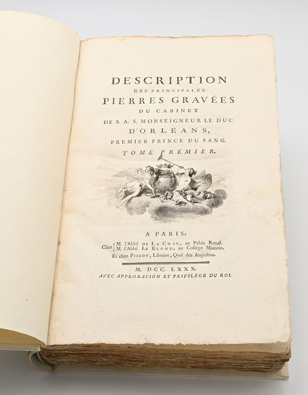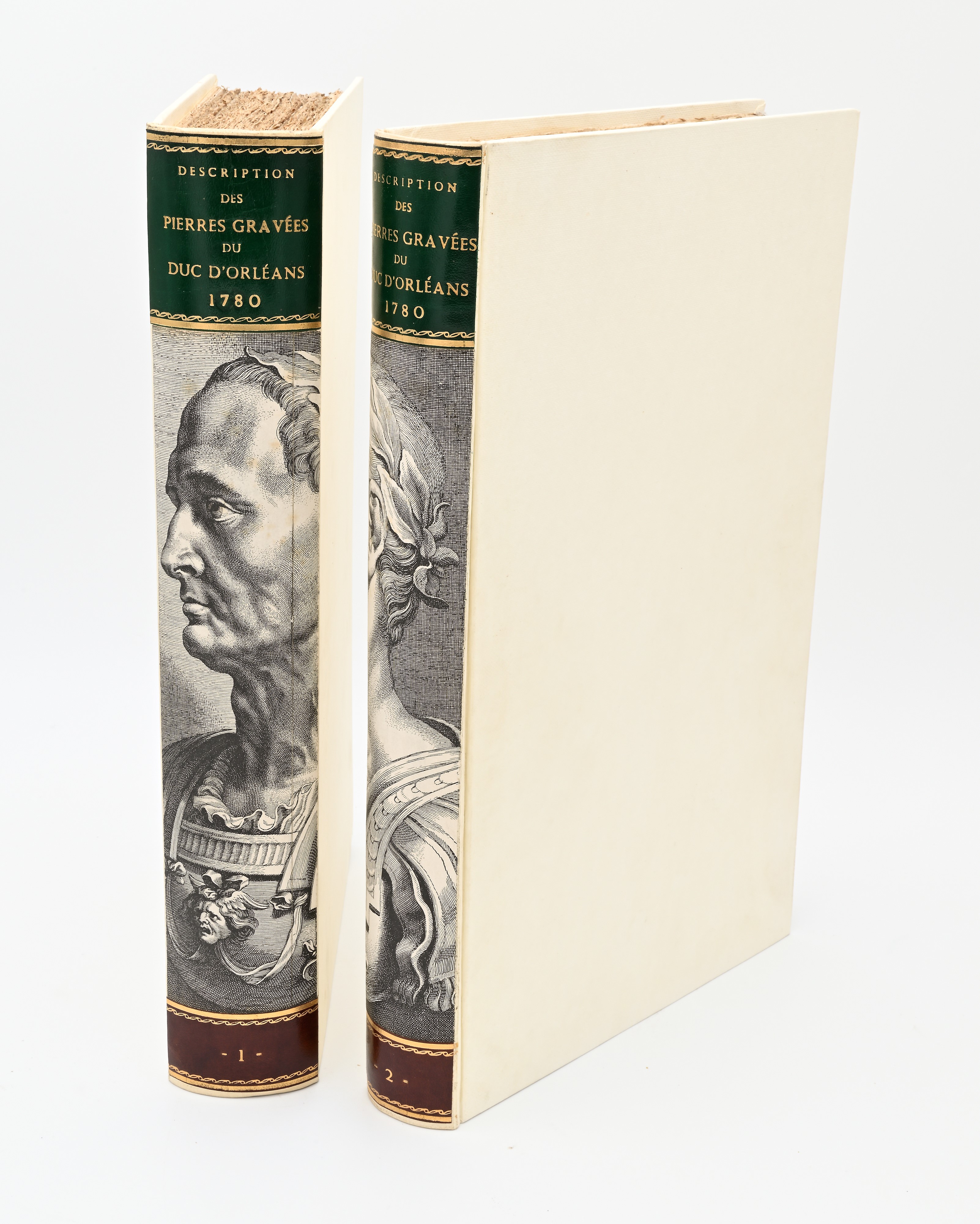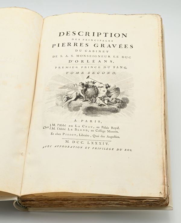 In 4° I due volumi descrivono la magnifica collezione di pietre e gemme incise appartenuta a Luigi Filippo Duca d'Orléans (1725-1785) che fu ereditata dal figlio Luigi Filippo II (1747-1798) prima di essere venduta a Caterina di Russia nel 1787. La maggior parte dei soggetti rappresenta divinità greche e romane, illustrate con incisioni a piena pagina nel testo. Manca però l'incisione che raffigura il Duca realizzata da Cochin. Legatura moderna in piena tela con dorsi figurati e tasselli di pelle con titolo in oro