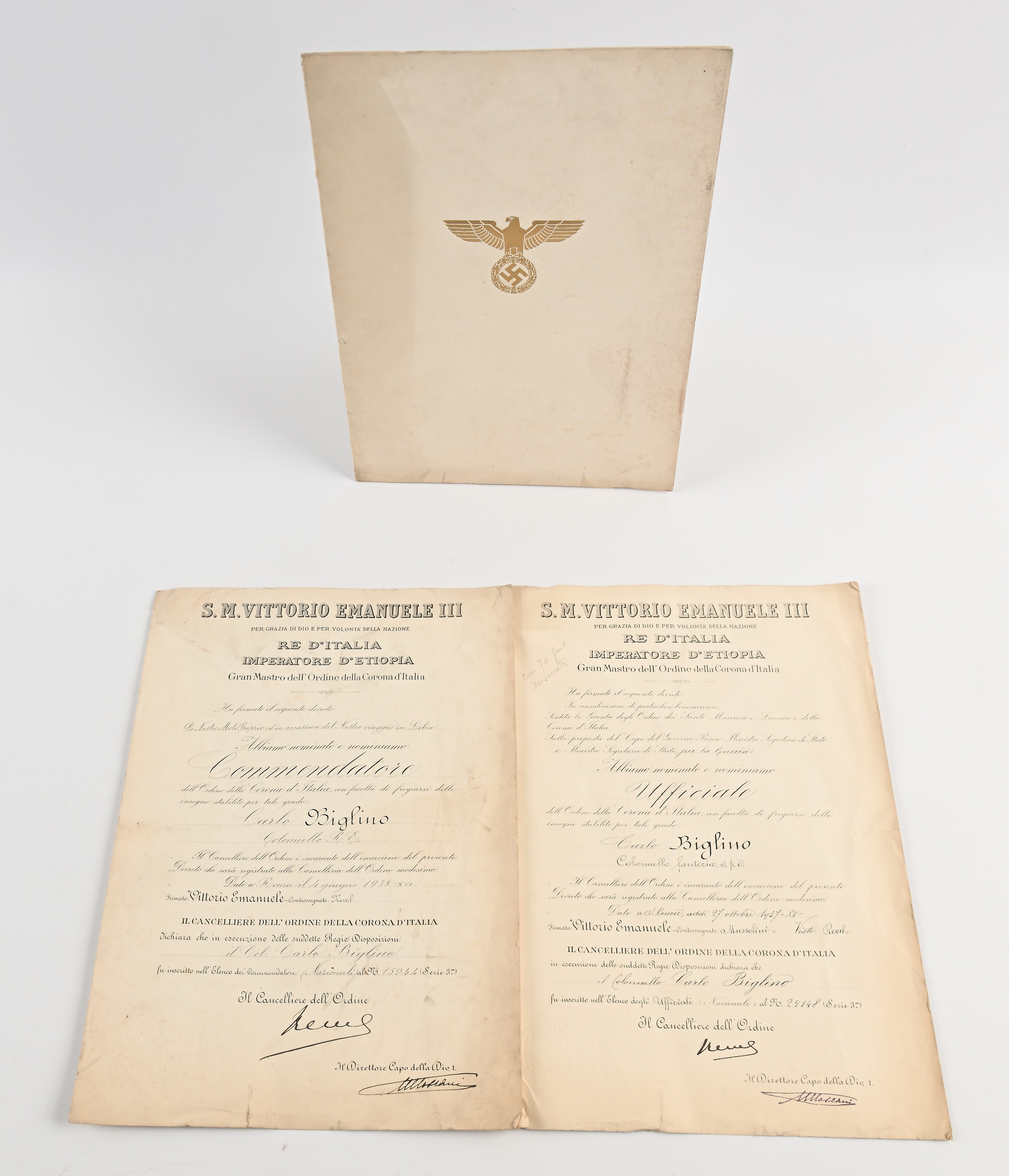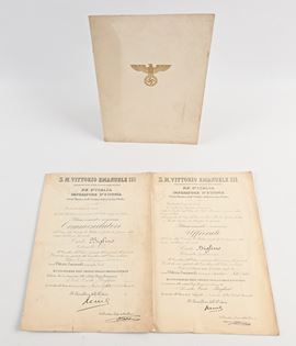 Diploma di Cavaliere con Stella e Spade dell'Aquila Tedesca dell'8 Aprile 1942 (Verdienstkreuz des Ordens vom Deutschenadler mit dem stern und mit schwertern) con il Regolamento del Verdienstorden vom Deutschen Adler + 2 Diplomi da Ufficiale e da Commendatore dell'Ordine della Corona d'Italia in data 1937 e 1938
