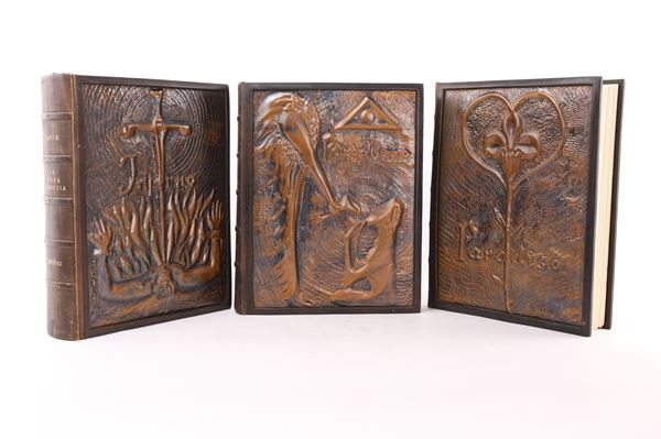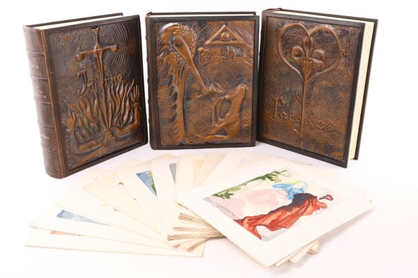 Divina Commedia con illustrazioni di Salvador Dalì. In edizione lusso a tiratura limitata con legatura artistica in pelle e piatti figurati in rame sbalzato. Entro cofanetti. Corredato dall'originale leggio in legno e vetro. Il Leggio misura cm 173,5x70x70, Arti e Scienze Salani, Firenze 1963-4