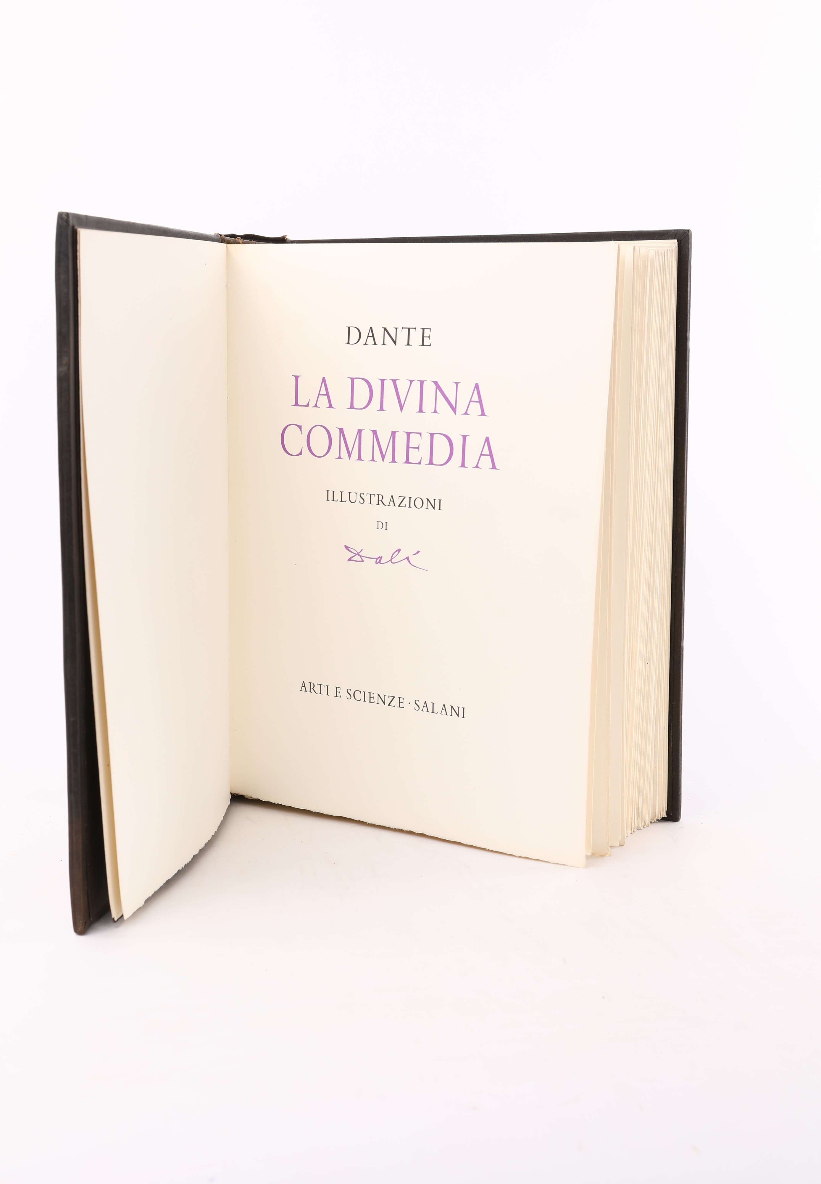 Sei volumi rilegati in 3 (Inferno, Purgatorio e Paradiso). Le tre cantiche, secondo l'edizione della Società Dantesca Italiana curata e rivista da Giovanni Nencioni, sono illustrate da 100 tavole a colori sciolte (all'interno dei volumi), di dimensione 355x280 mm, create da Salvador Dalì e realizzate dal Maestro Raymond Jacquet a Parigi. Impressa sotto la direzione di Giovanni Mardersteig in 3000 esemplari numerati (Ns n.34) dalla Stamperia Valdonega di Verona su carta a mano dei Fratelli Magnani di Pescia. Questa magnifica edizione, realizzata in occasione del 700° Anniversario della nascita di Dante, viene giustamente considerata uno dei capolavori dell'opera di Dalì illustratore. Realizzata in occasione del 700° Anniversario della nascita di Dante. Entro cofanetti di legno rivestiti in pelle. Corredato dall'originale leggio in legno e vetro. Il Leggio misura cm 173,5x70x70
