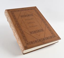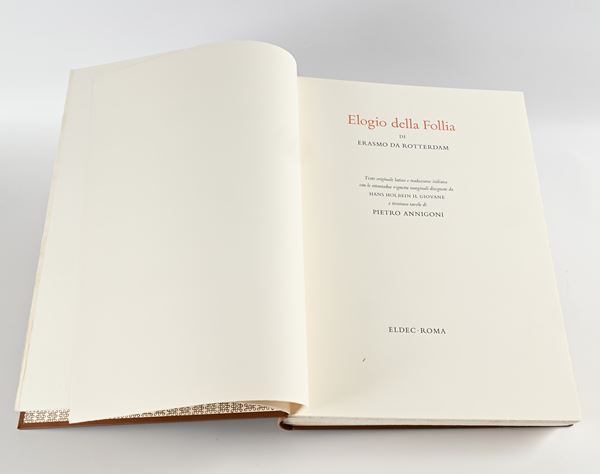 Erasmo da Rotterdam Elogio della follia. Illustrato con 31 tavole a colori di Pietro Annigoni. Esemplare completo della lastra in argento 925/000 e della litografia su pergamena firmate dal Maestro; edizione limitata a 2.565 esemplari numerati, ns. n.642, Eldec, Firenze 1978