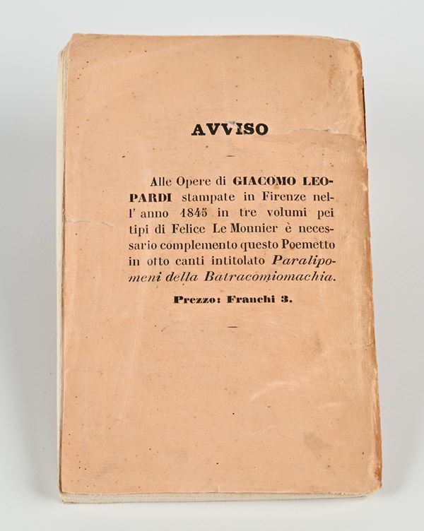 In 8°. Si tratta di una delle 2 ristampe fiorentine realizzate dell'editore fiorentino Le Monnier, che ristampò per due volte l'edizione del Baudry, Parigi 1842, lasciando invariato il frontespizio originale coi dati tipografici. Sul piatto posteriore reca la scritta: “Alle Opere di GIACOMO LEOPARDI stampate in Firenze nell'anno 1845 in tre volumi pei tipi di Felice Le Monnier è necessario complemento questo Poemetto in otto canti intitolato Paralipomeni della Batracomiomachia. Prezzo: Franchi 3.”. Le Monnier per completare l'edizione delle Opere di Giacomo Leopardi, curata nel 1845, acquistò le rimanenze del Baudry e le rimise in vendita, sostituendo però l'originaria brossura gialla con una nuova rosa. Le due ristampe fiorentine si distinguono dagli esemplari parigini per l'uso di differenti caratteri di stampa, per la correzione degli errori nel testo e la conseguente eliminazione dell'errata, tra cui a p. 53, r. 1 “MARAVIGLIA” in “Maraviglia” e a p. 22, r. 8 “carrozzevole” è sostituito da “carezzevole”. Fioriture sparse con leggere bruniture. Legatura in brossura editoriale rosa con difetti.