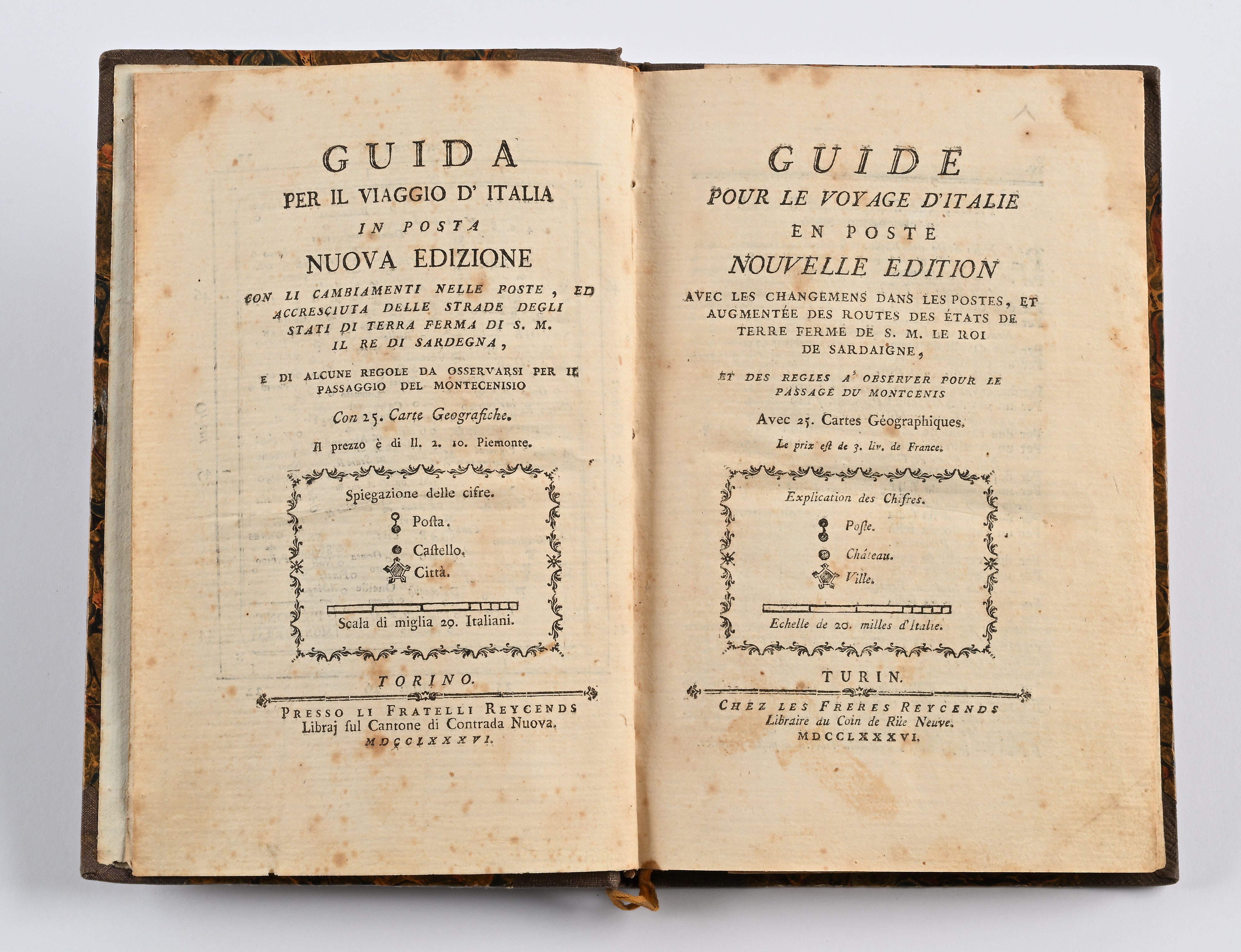 Guida per il viaggio d'Italia in Posta Nuova Edizione con li cambiamenti nelle Poste, ed accresciuta delle Strade degli Stati di Terra ferma di S. M. il Re di Sardegna, e di alcune regole da osservarsi per il passaggio del Montecenisio, Fratelli Reycend, Torino 1786