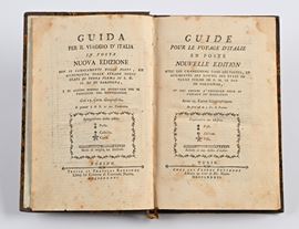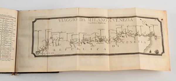 In 8° Rara guida delle poste degli antichi Stati d'Italia con 25 carte di tavole geografiche più volte ripiegate raffiguranti gli itinerari postali e 1 Tavola con le città di confine tra Piemonte Savoia e e Francia. Doppio frontespizio e testo in italiano e in francese. Legatura posteriore in mezza tela con angoli. Gore alle ultime carte con diffuse fioriture e macchie