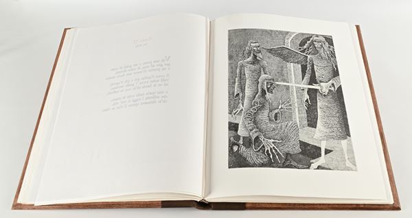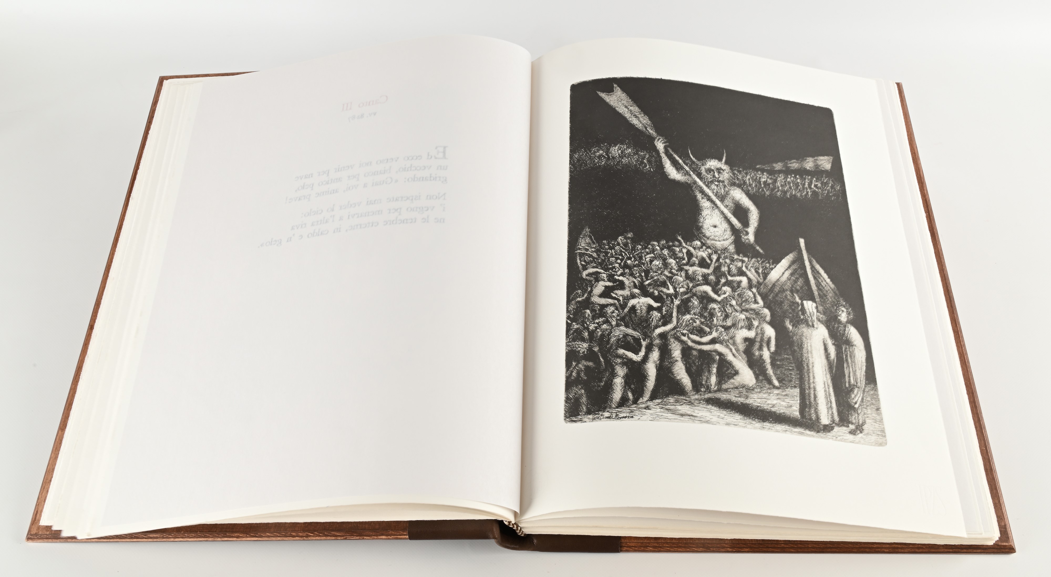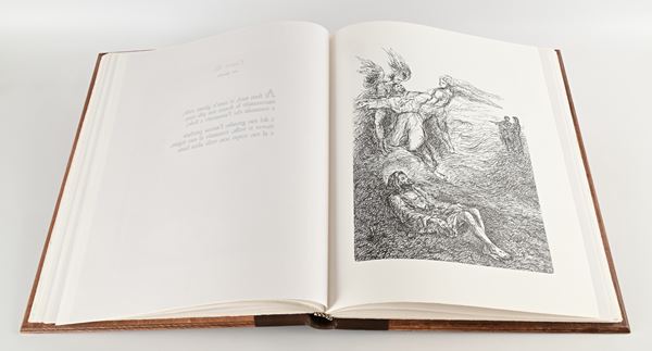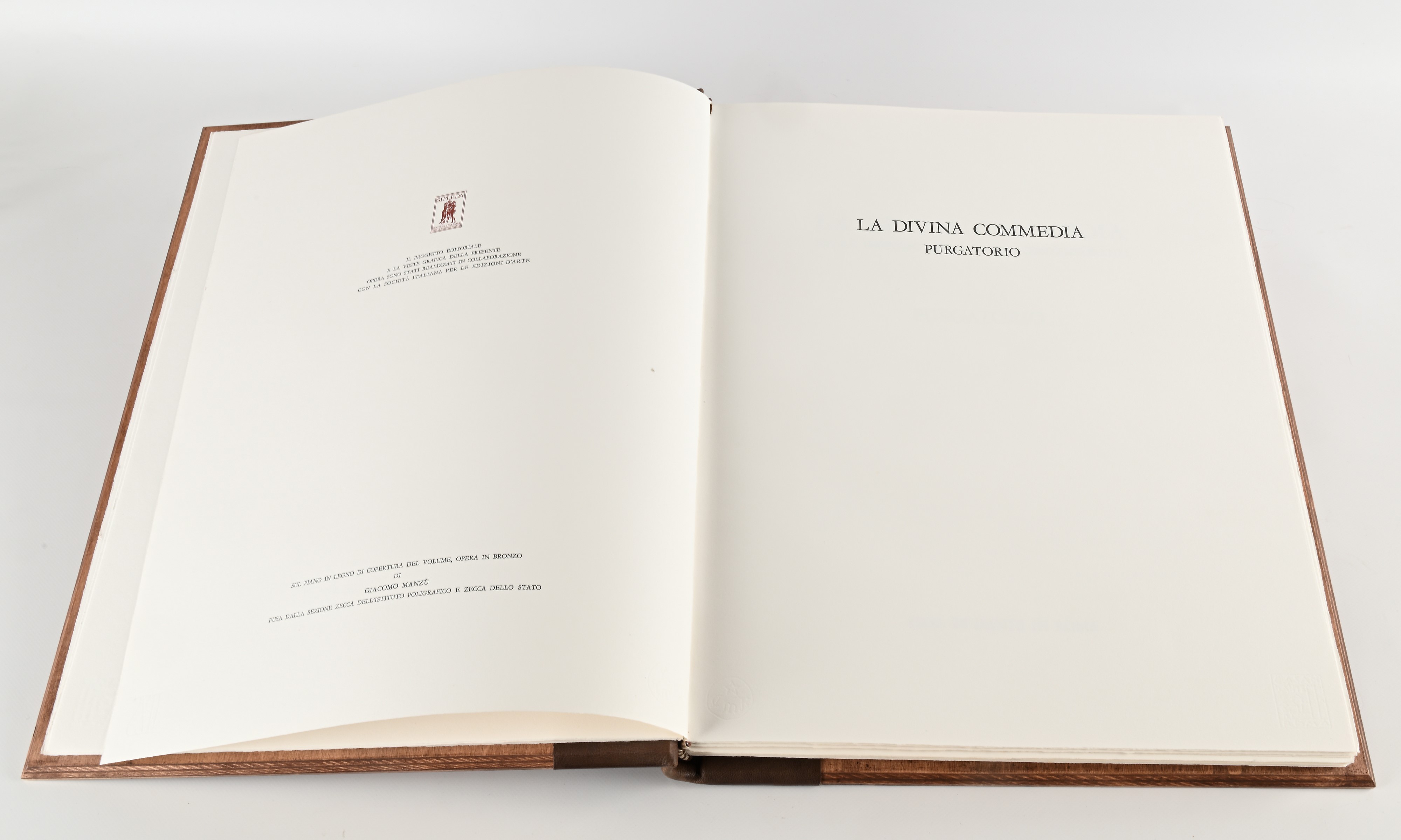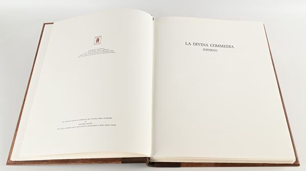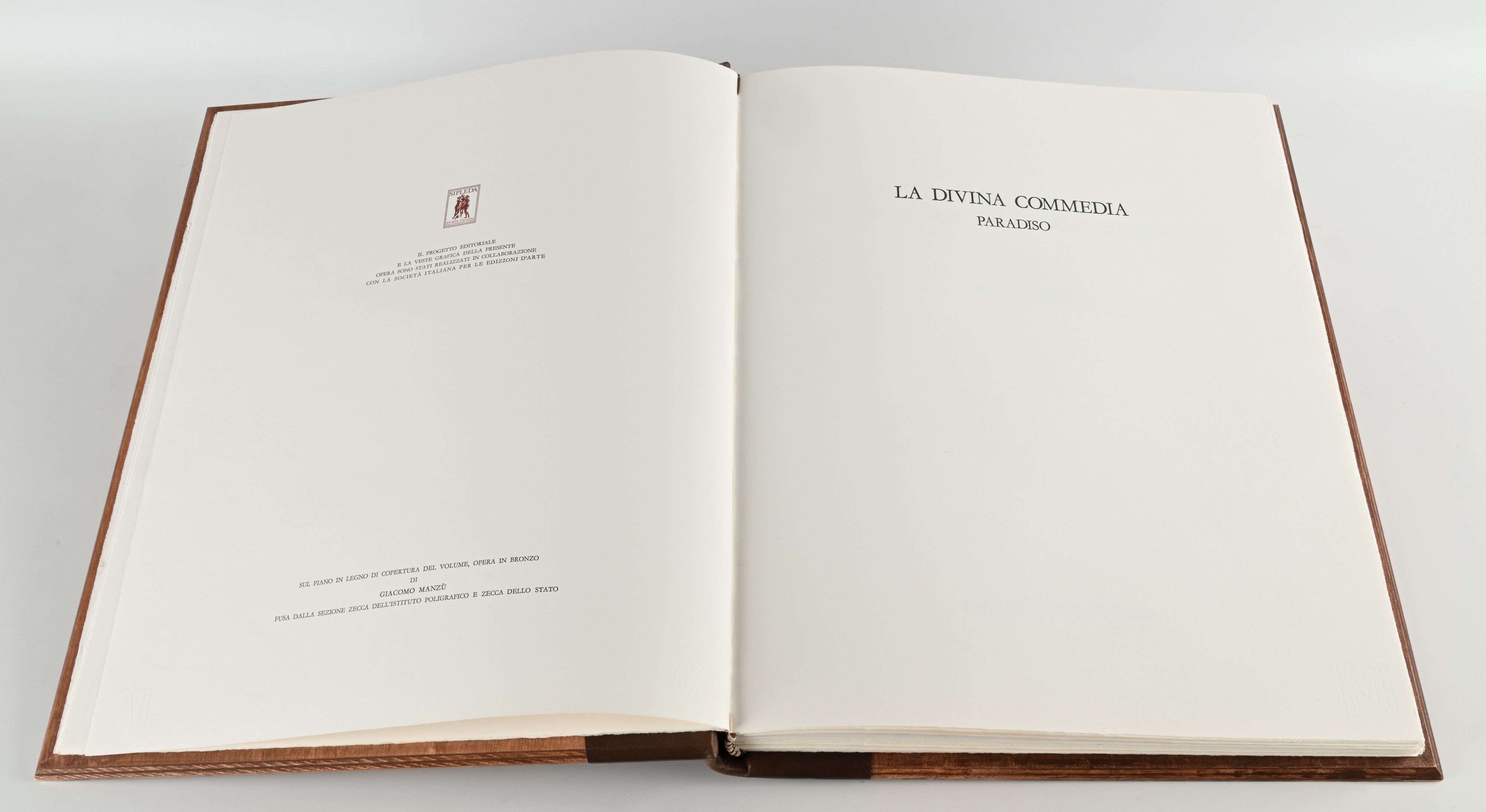 Superba edizione in 3 volumi in formato atlantico, con rispettivamente 34, 33 e 33 tavole calcografiche fuori testo riprodotte su carta speciale Rosaspina delle cartiere Milani di Fabriano, accompagnate dai passi della Commedia impressi su carta pergamenata. Splendida legatura in mezza pelle a 5 nervi con piatti di legno con titoli e fregi in oro ai dorsi, con applicate ai piatti anteriori di ciascun volume 3 medaglie di bronzo di Giacomo Manzù dell'IPZS. Entro cofanetto originale di legno ricoperto di velluto