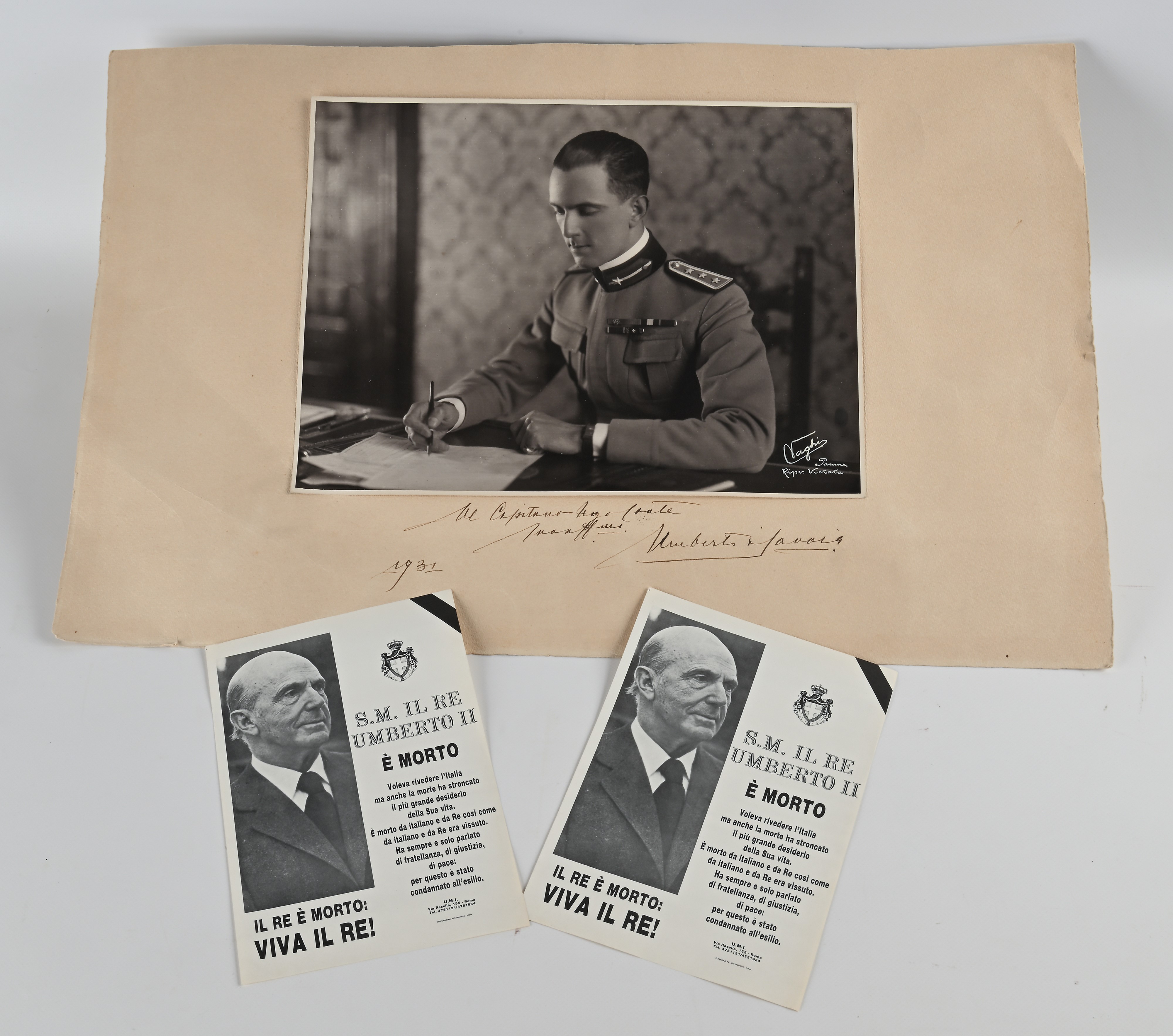 Luigi Vaghi - Foto di Umberto II di Savoia con dedica autografa datata 1931 E 2 locandine della morte, Azienda Fotografica Vaghi Parma