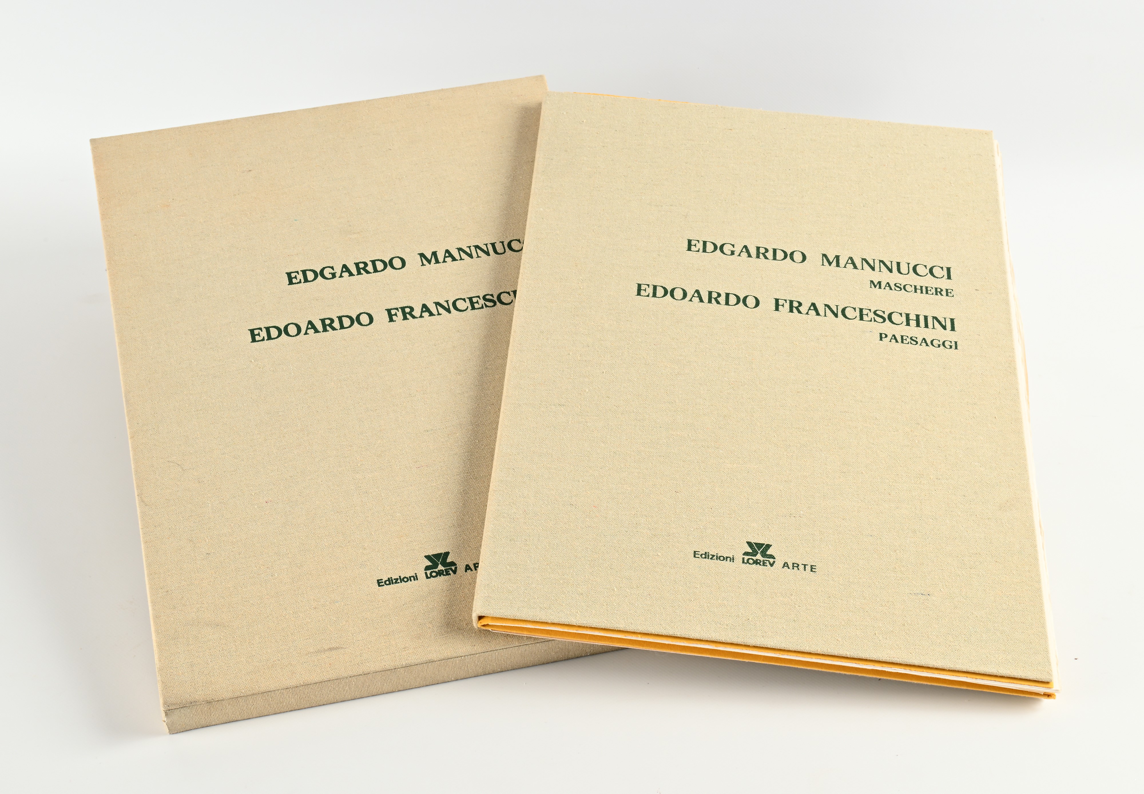 Mannucci Edgardo Maschere / Franceschini Edoardo Paesaggi - 3 grafiche e tecnica mista firmate a mano di Edgardo Mannucci con intervento a mano dell'Artista e 3 serigrafie firmate a mano di Edoardo Franceschini. Esemplare arricchito di una P.d'A. di Franceschini. Tiratura limitata a 150 esemplari ns. n.116, Edizioni Lorev Arte 1982