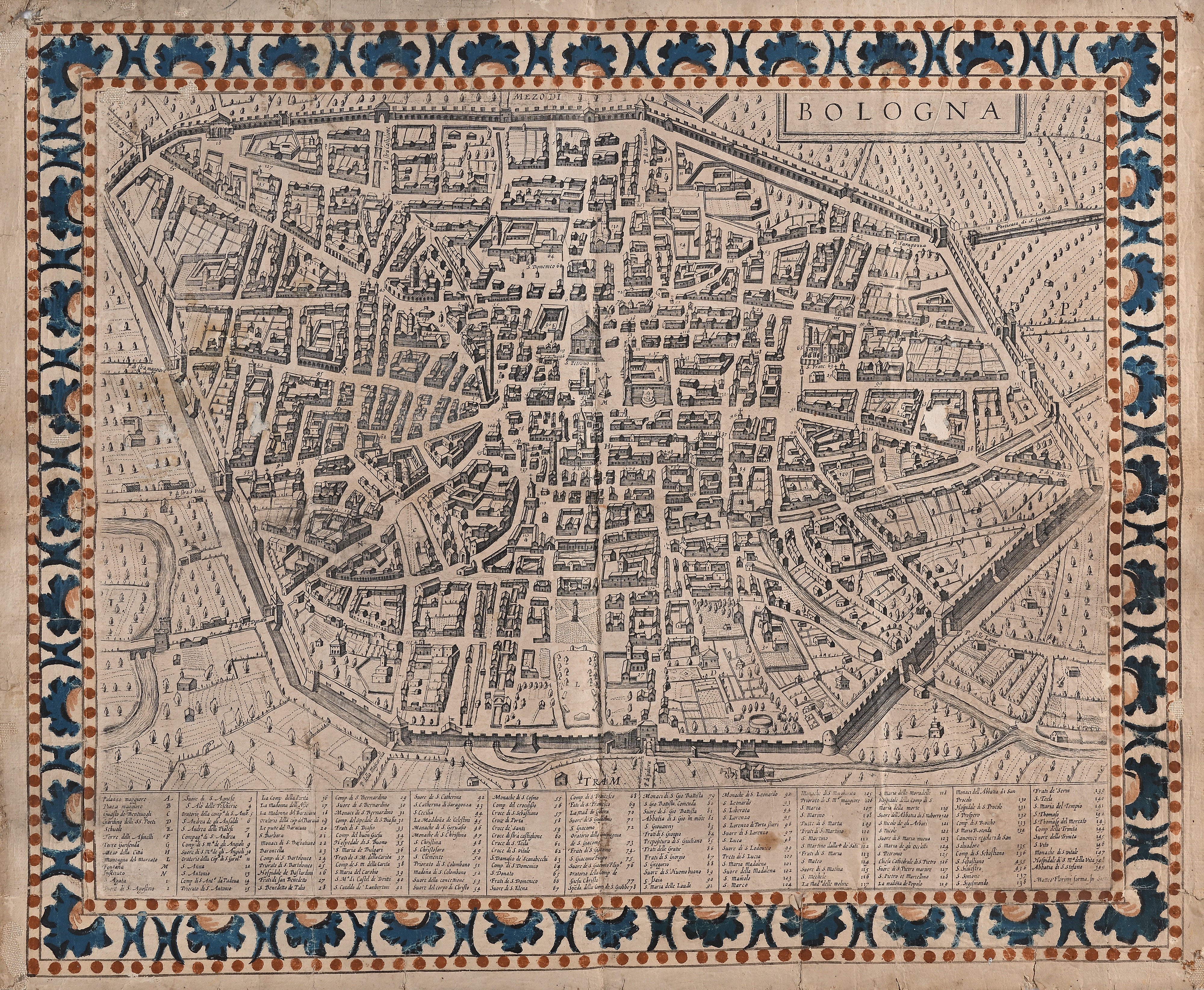 Raro esemplare della stampa incisa a Siena dall'editore, tipografo e stampatore di origini calabresi Florimi, che deriva della Pianta del 1582 del Duchetti a sua volta derivante da quella del Carracci del 1581. Rappresenta la città alla fine del '500 con maggiore attenzione alle chiese e gli edifici religiosi non tralasciando però il complesso attorno a Piazza Maggiore, oltre alle torri, alle mura e alle fortificazioni. Corredata da una Legenda alfanumerica con 149 + 12 indicazioni topografiche. Montata su tela con cornice decorata ad acquerello. Lievi difetti tra cui le piegature e mancanze