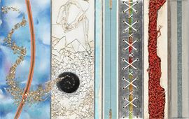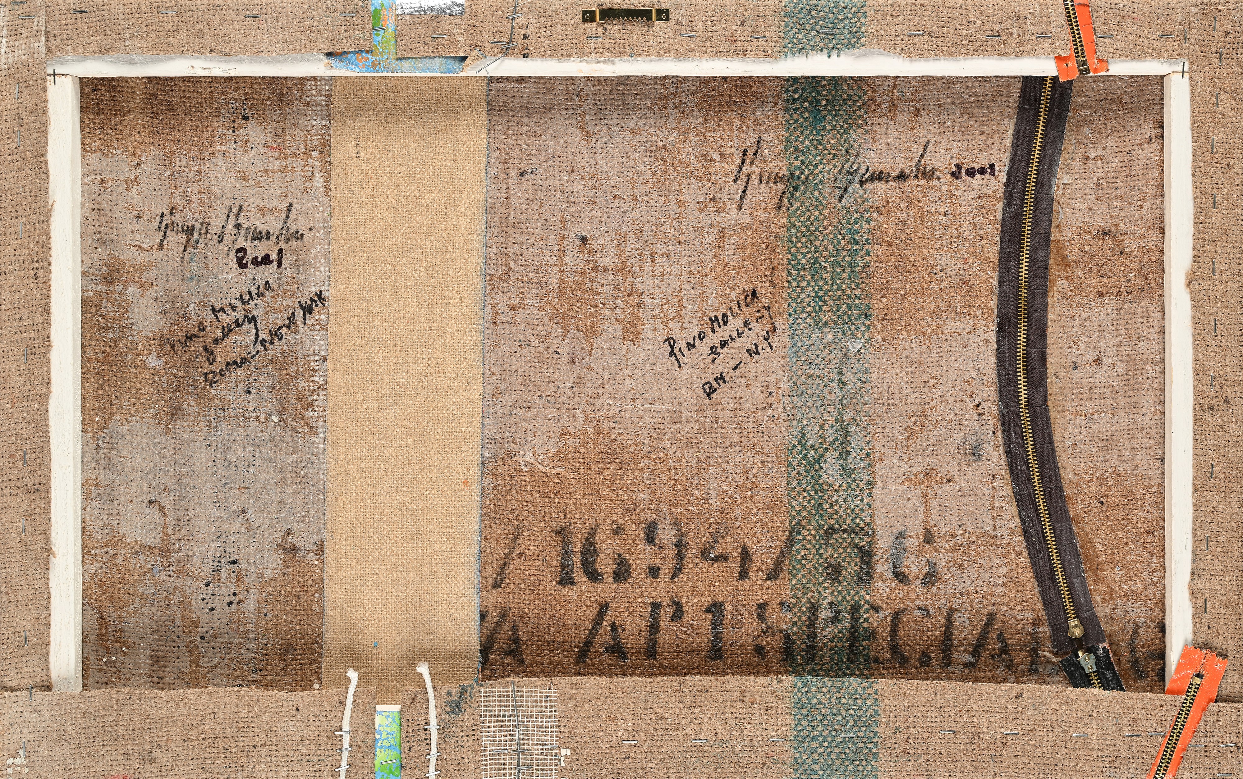 Polimaterico (griglie di metallo, lacci, zip, carta, metallo) e spray su tela di juta