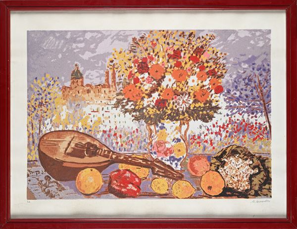 Natura morta con vaso di fiori e mandolino