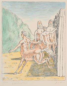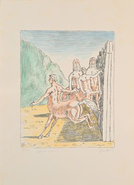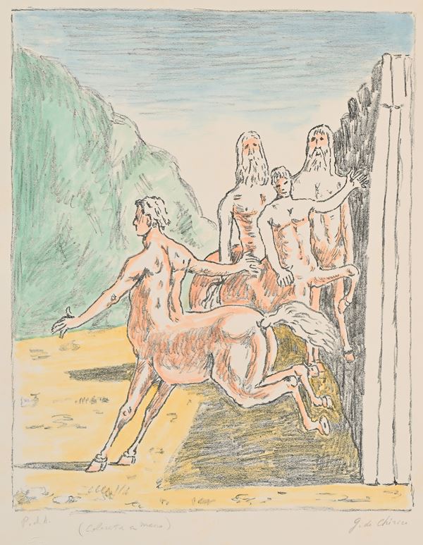 Firma e numerazione "G. De Chirico p.d.a. colorata a mano". Timbro a secco "Giorgio De Chirico" e "Alberto Caprini stampatore in Roma".